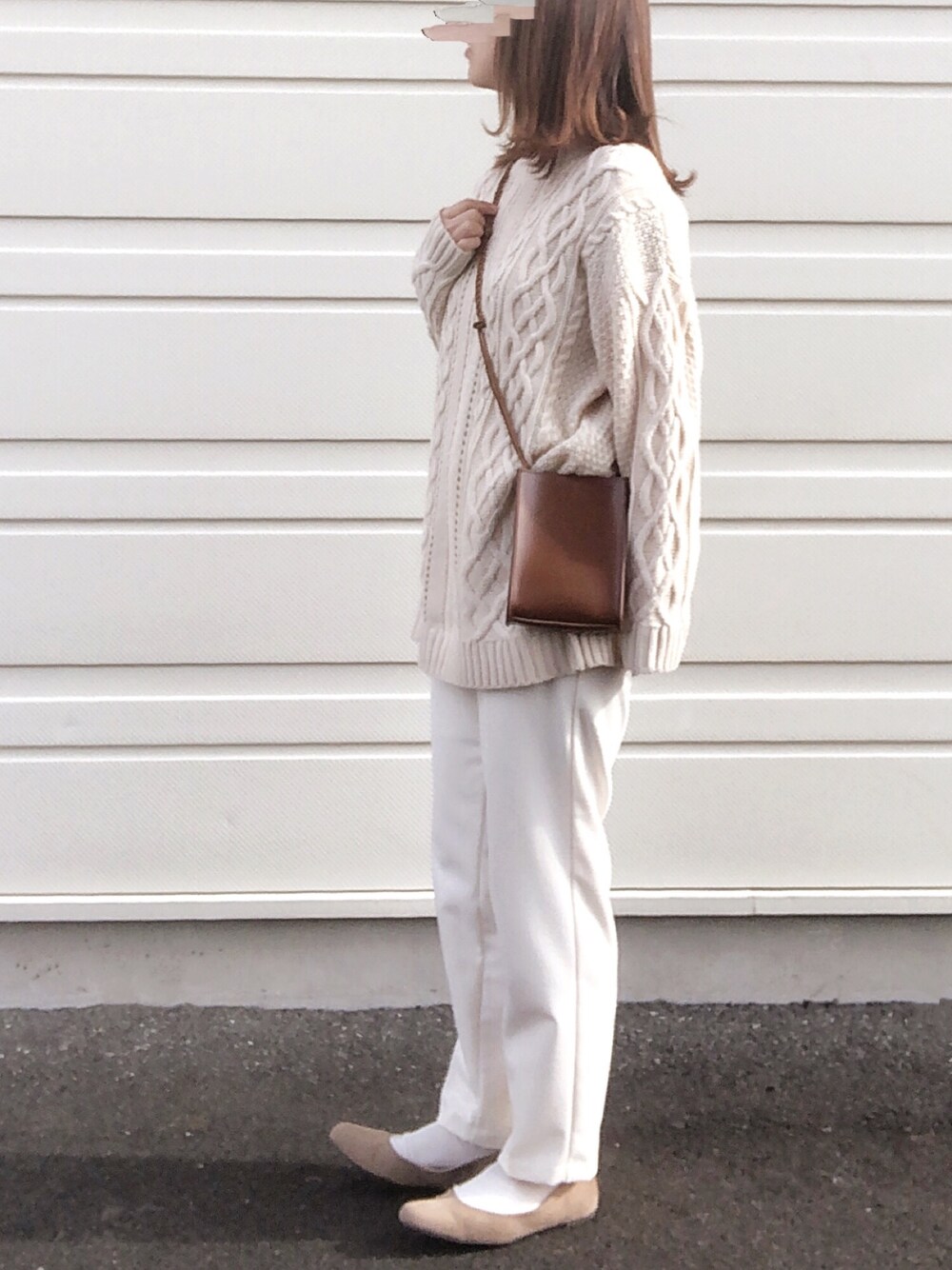 しまむらのケーブルニットに GUの起毛タックテーパードパンツ☺︎ オフホワイトに ブラウンとベージュの小物を合わせて 優しい色味のワントーンコーデ♪̆̈ バックの上あたりのニットがもちゃっとなりましたᐠ( ᐝ̱ )ᐟ いいねお気に入りフォロー ありがとうございます٭