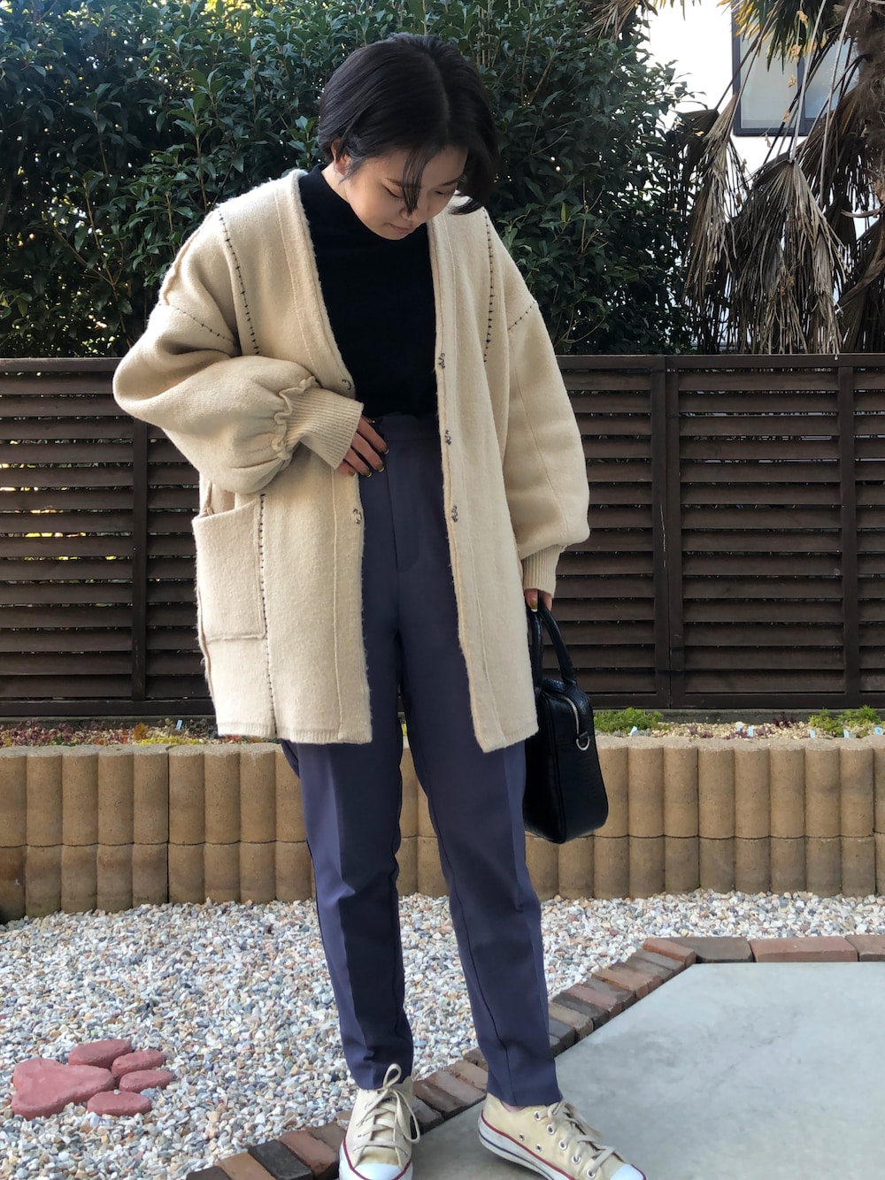 🖤プルオーバー 🍞Kastane カーディガン 🥶GU スラックス 🥚CONVERSE スニーカー Instagram→me__iil