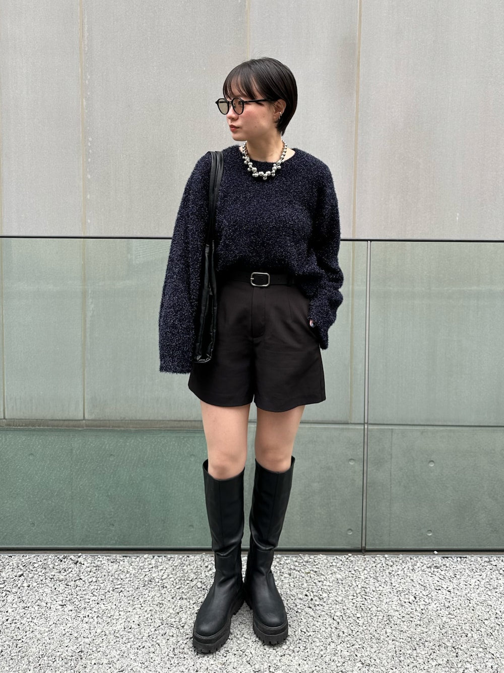 トレンド情報: ネイビー × グレー ラメニット ショートパンツ × ロングブーツ 大きめアクセサリー