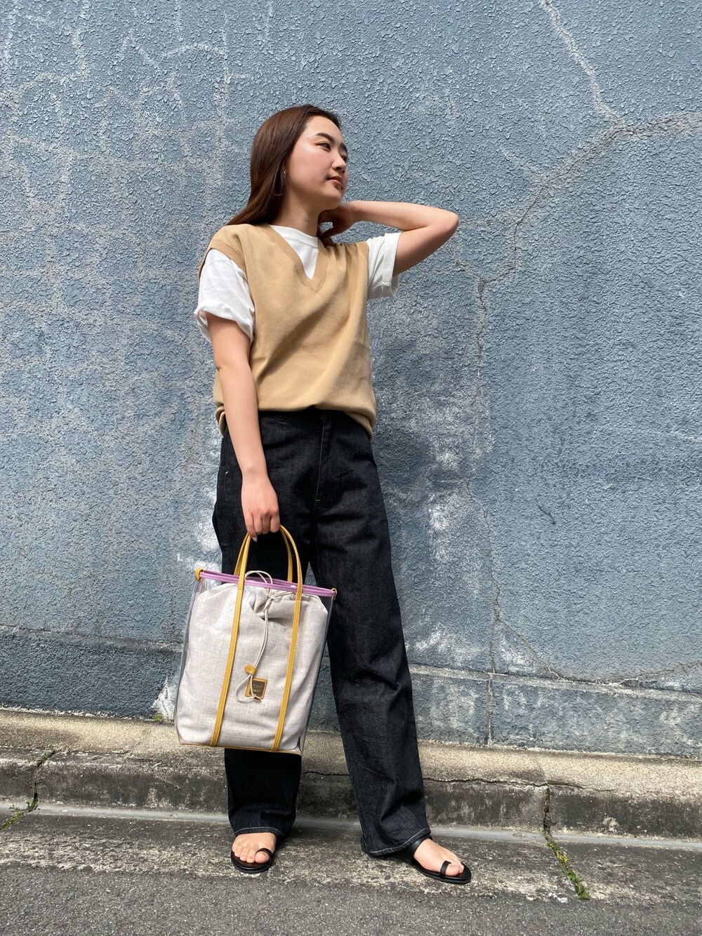 シンプルな白Tにベストを合わせた大人カジュアルなコーデにしました。 暗めのデニムを持ってくることでカジュアルになりすぎないところがポイントです〜!