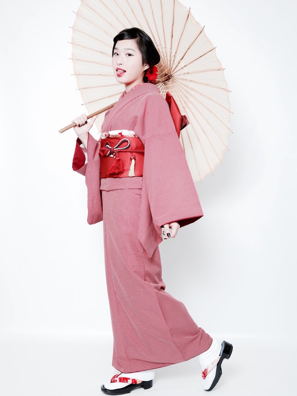 レッド系の浴衣を着用したレディースの冬コーディネートの1枚目の写真