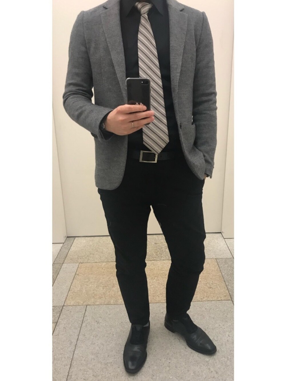 ジャケパンスタイルのモノトーンコーデです💡 黒シャツ、黒パンツ、ベルトと革靴も黒で合わせて、グレーのジャケットとグレー系のネクタイを合わせてみました❗️