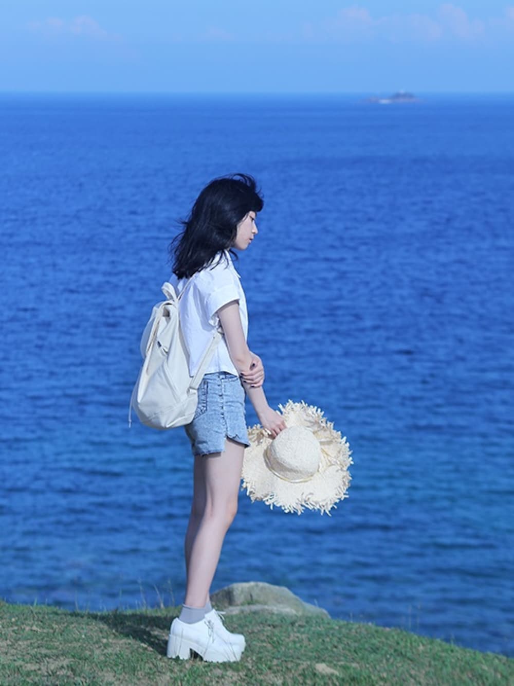 ホワイト系のシャツ/ブラウス、ホワイト系のバックパック/リュック、ホワイト系のブーツを着用したレディースの春コーディネートの1枚目の写真