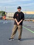 2022.06.11 AVIREXららぽーと横浜店STYLE オリーブのパンツと黒のTシャツ! 胸元のロゴのオレンジとパンツのオリーブがいい色味ですよね!!