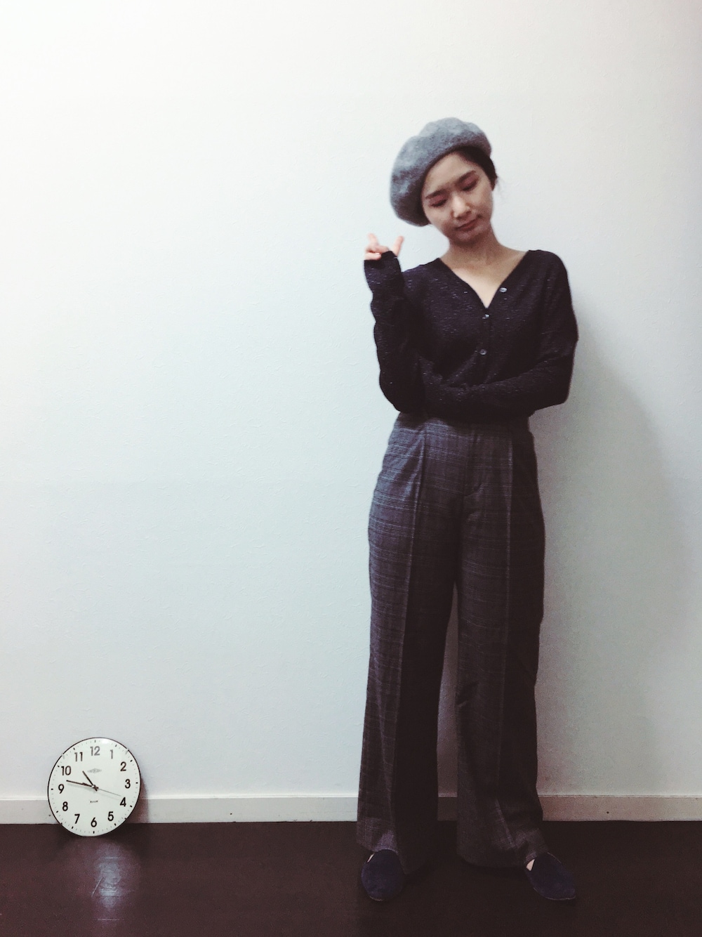 ラメなカーデとチェックパンツとベレー帽。 服がブルーとグレーなので、メイクはピンクになってます。実は。