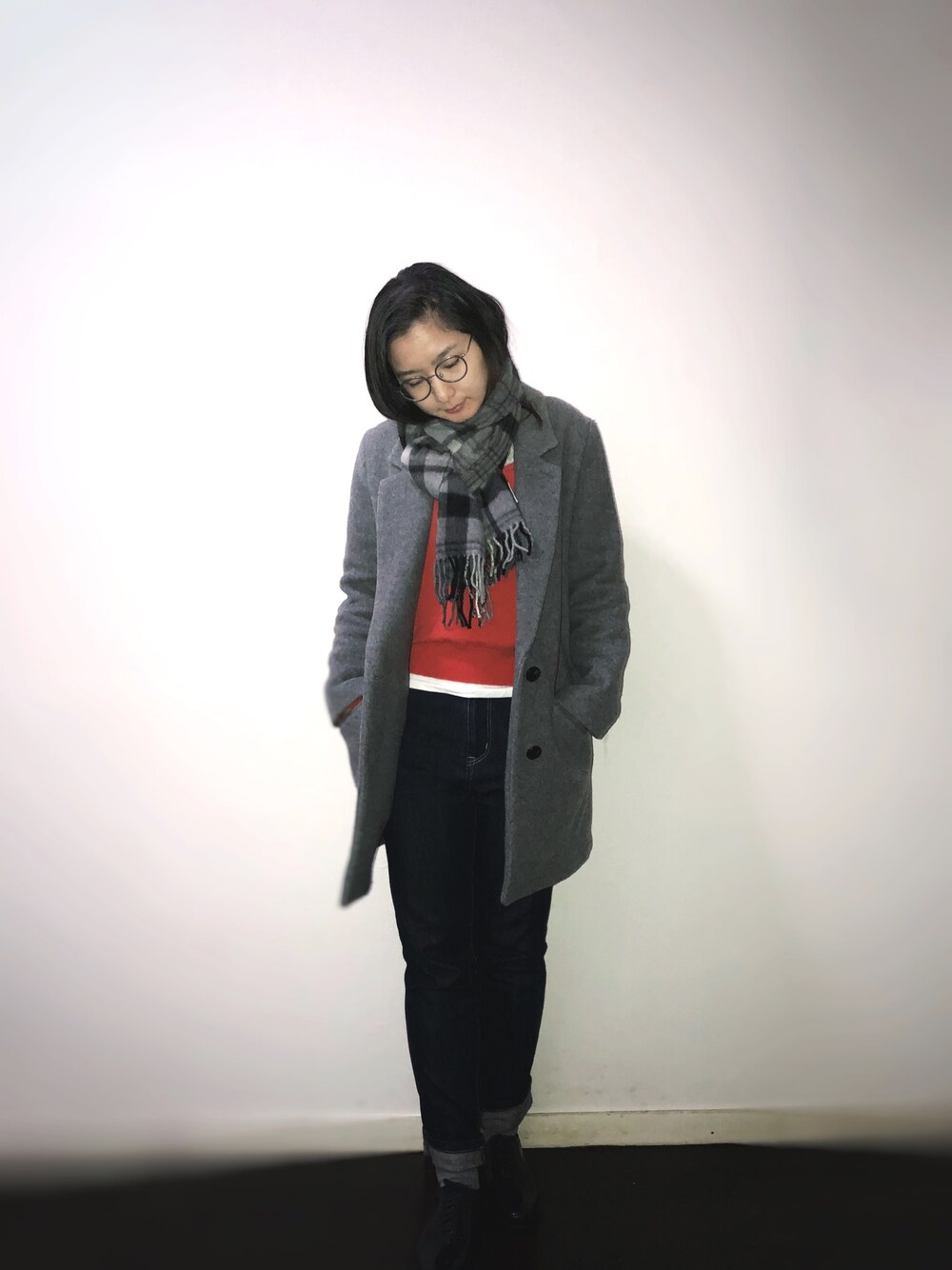 グレー系のストール/ショールを着用したレディースの秋コーディネートの1枚目の写真