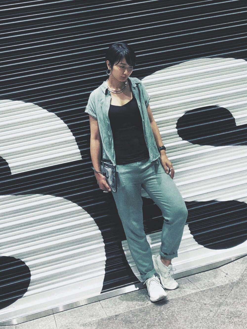 リネンセットアップ。 着方、これしかできないけど 小物選びで変化楽しんでます♪