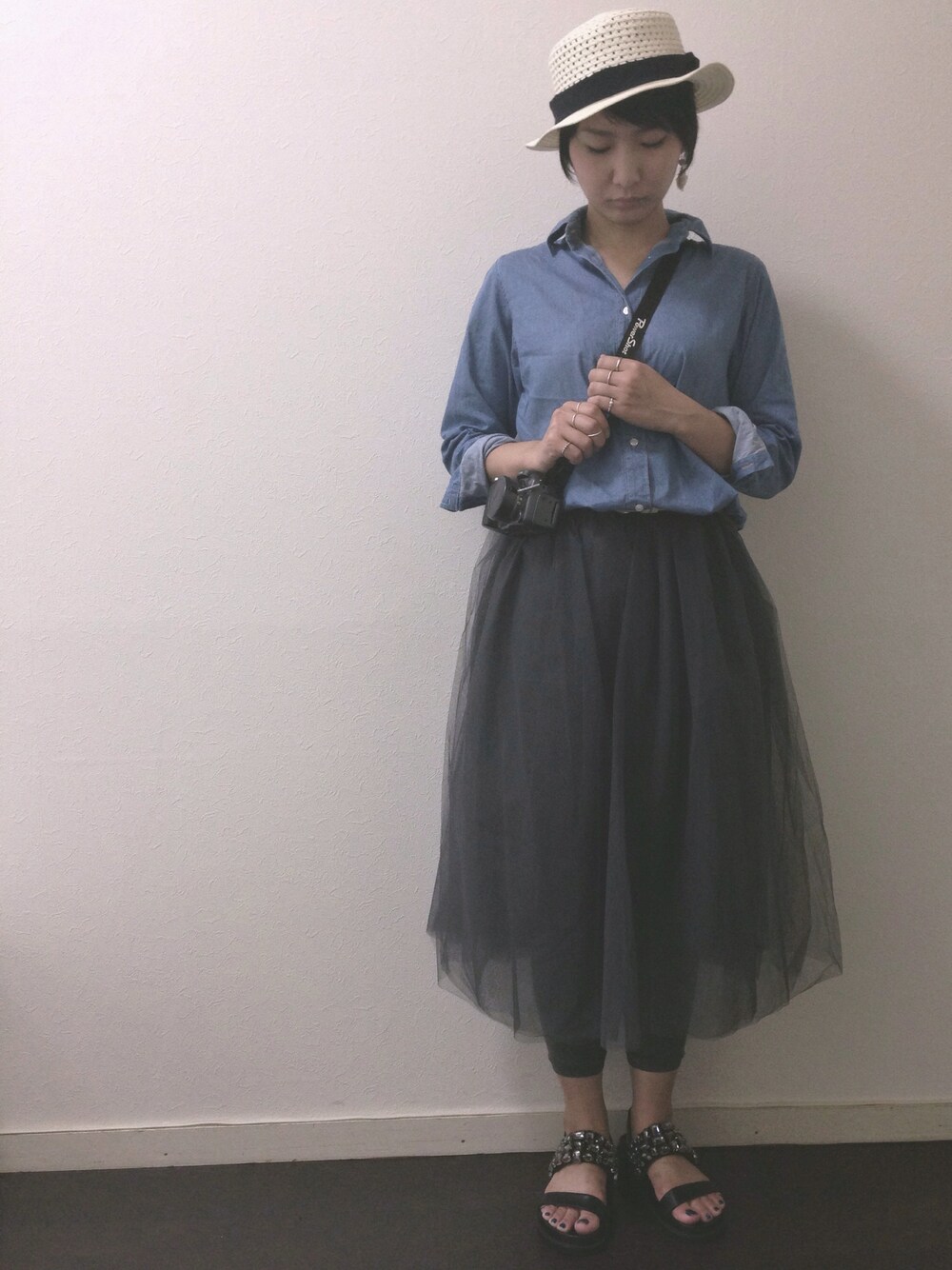 詳細は後ほど。 ---------- チュールスカートでお出掛けコーデ。 ほぼ一目惚れで、スカートとサンダルをネットでポチッとしました♫ 1日外の予定なので、デニムシャツとレギンスでカジュアルに。 シャツだと襟が首元の日除けにもなるかなと。同じ理由でハットも選択。 スニーカーも良かったけど、ちょいモード感もあるビジューサンダルで。 あとはアクセを華奢ながらモリモリつけて、ちょっと差がつくと良いなぁなんて。(でも、指輪、関節につけたら失くしました。涙) 友達と会う時は、やっぱり思う! オシャレにーーーぃ!! +゚。*(*´∀`*)*。゚+……自己満ですが。 涼しい顔して、ね。 でも、TPOや会う人のこと考えて コーデ組むのは難しいけれど 楽しいですヽ(。>▽<。)ノ