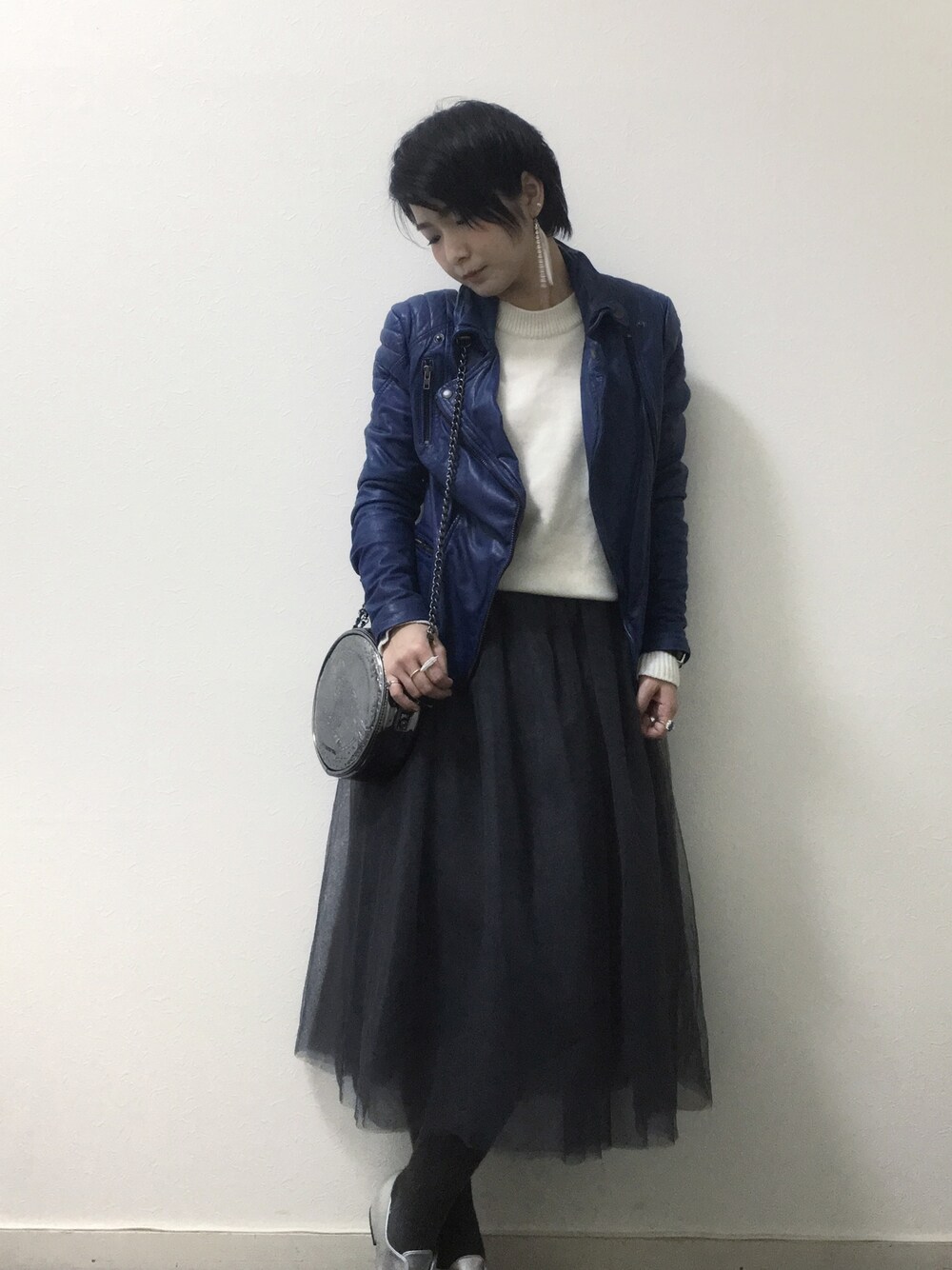 ひっさびさのスカートコーデでございます。 きゃーーーー!!٩( ๏ ๏)۶💦 でも、ブルーのライダースやメタリックな小物たちで全く甘くしないでまとめてみました♫ お出掛け用の小さめバッグ、欲しい…⑅◡̈* 靴はネットでポチッて今日届きました♫ サイズ良さそうだけど、何故だか家から駅までの間に2回も滑って転びました💦 やー、恥ずかしかったです(T^T) 何が悪かったのかなー(๑ŏ _ ŏ๑) ファーも持ってきたけど、要らなかったかなー? ではでは、素敵な夜をねー♫