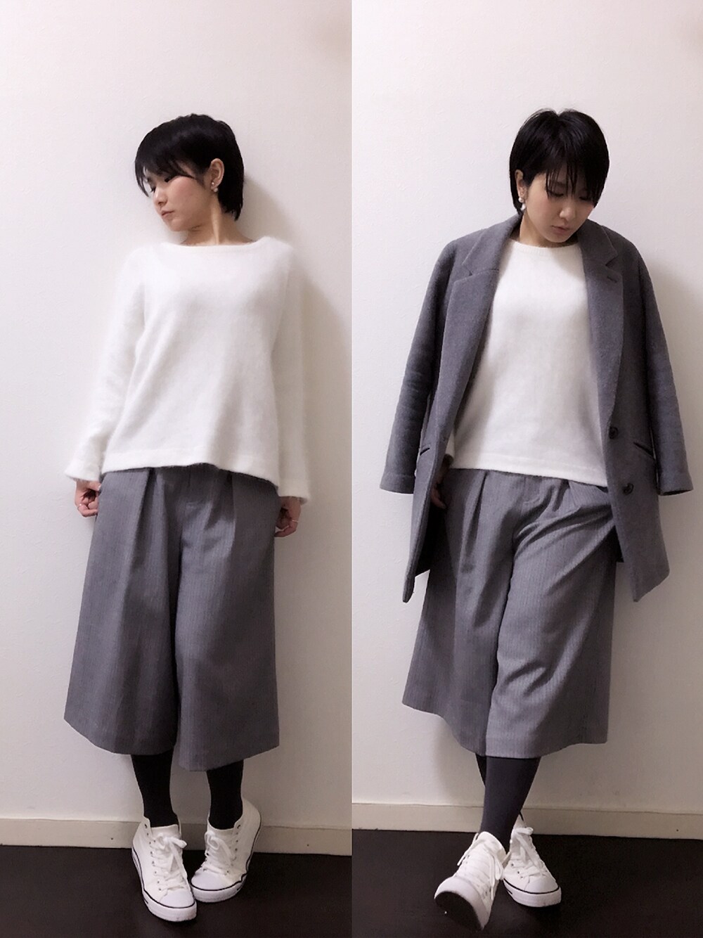 白×グレー。 んまぁ、いつも通りだこと♫ このニット、フワッフワですけど、 ブラッシングで綺麗になるんですよん♡