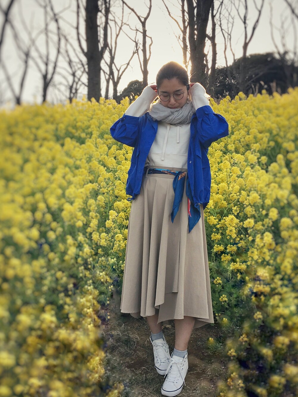 青とスポーティとトレンド感を混ぜこぜしたコーデ。 今年はスカーフいっぱい使いたいです٩( ᐛ )و 新しくブルーのスカーフが私の青コレクションに仲間入り⑅◡̈*