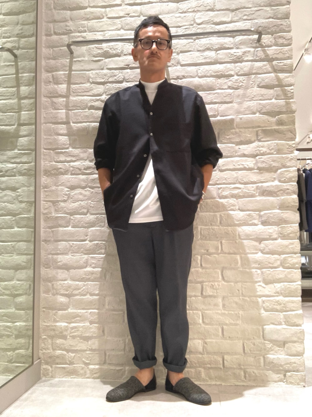 ◀︎MY SIZE▶︎ ⭐︎171cm/63kg⭐︎ トップス👔→46 アムンゼン素材がとにかく軽くて柔らか。黒でも重く感じません。キーネックの襟がインナー遊びを楽しめます! インナー👕→46 この時期からはモックネック、役立ちます!半袖だと暑がりの方でも秋スタイル楽しめますよ! ボトムス👖→ 44〜46 波打つ素材がブラックトップスとの相性良しです。オトナなゆるさで是非スリッポンで合わせてください!