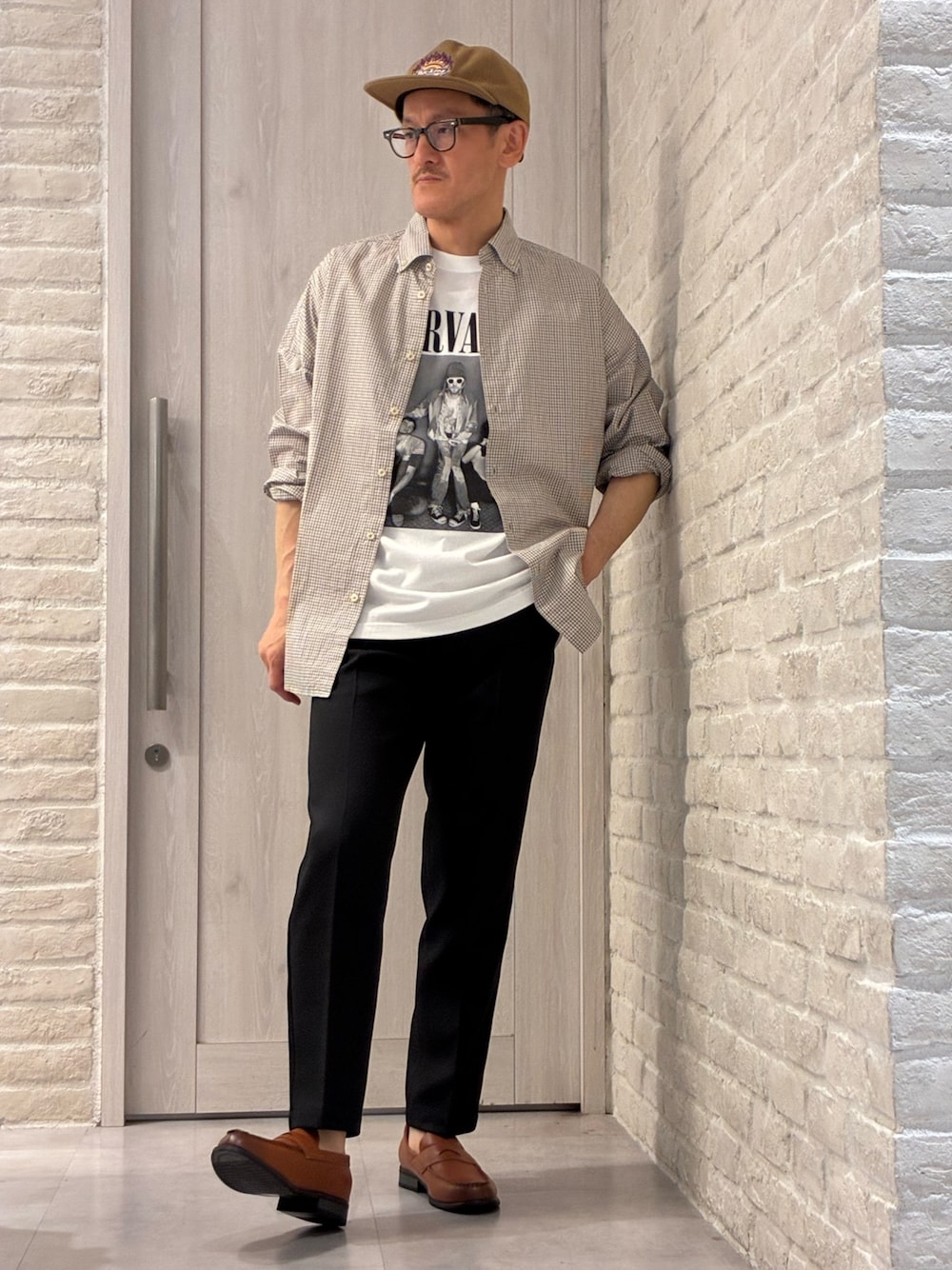 ◀︎MY SIZE▶︎ ⭐︎171㎝/63kg⭐︎ トップス👔→46 こ綺麗なチェックが汎用性高く便利です! ボタンダウンなのもキレイに合わせるチェックポイント。 インナー👕→46 カッコ良すぎるプリントです。やっぱりバンドTシャツは白が素敵! ボトムス👖→46 細身です。ポリエステルのツヤがスラックスのラインと合います。 ラフなトップスをバランスよくしてくれます!