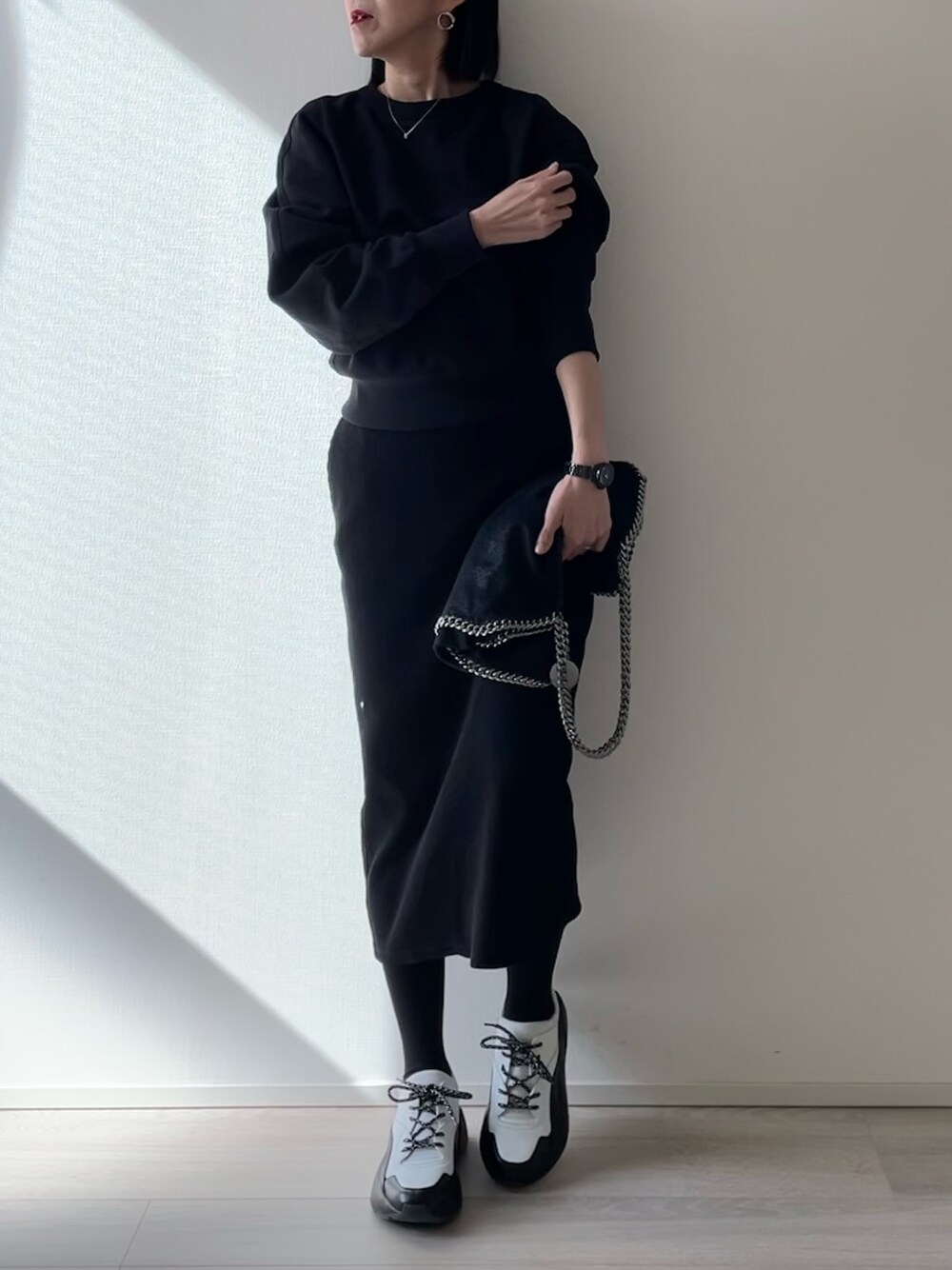 皆様おはようございます☀️ いつもご覧いただきありがとうございます😊 いいね、セーブ、フォロー、 と嬉しいです✨ 前回フォルダーINくださった まぽゆとちゃん、松波さん、ぱぱさん、たまにさん、あみぃちゃん、たけるさん、suits_segawaさん、MR.Mさんありがとうございました♥️ 皆様には感謝の気持ちでいっぱいです🙏 🖤BLACKコーデ🖤 カジュアルな素材を選びリラックス感を。 ディテールは女性らしさを意識して コンパクトなスエットとタイトスカート。 足元は、ダットスニーカーでマスキュリンな印象に。 シンプルなコーデだからこそ、バランス感を大切に❤️