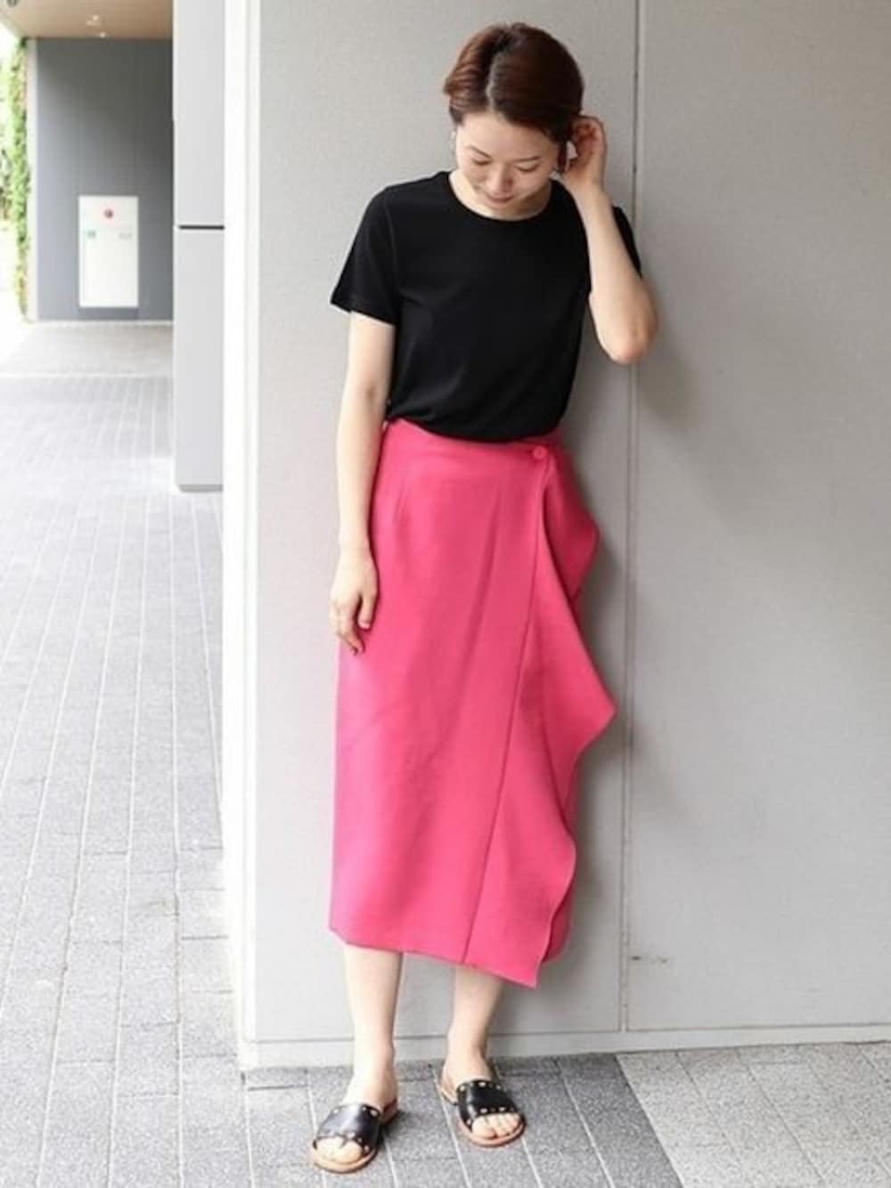 華やぎスカート ラッフルデザインと色鮮やかなピンクのカラーで存在感たっぷりのスカート。 シンプルなクルーネックニットとあわせて、スカートを引き立たせたスタイリングにしてみました。