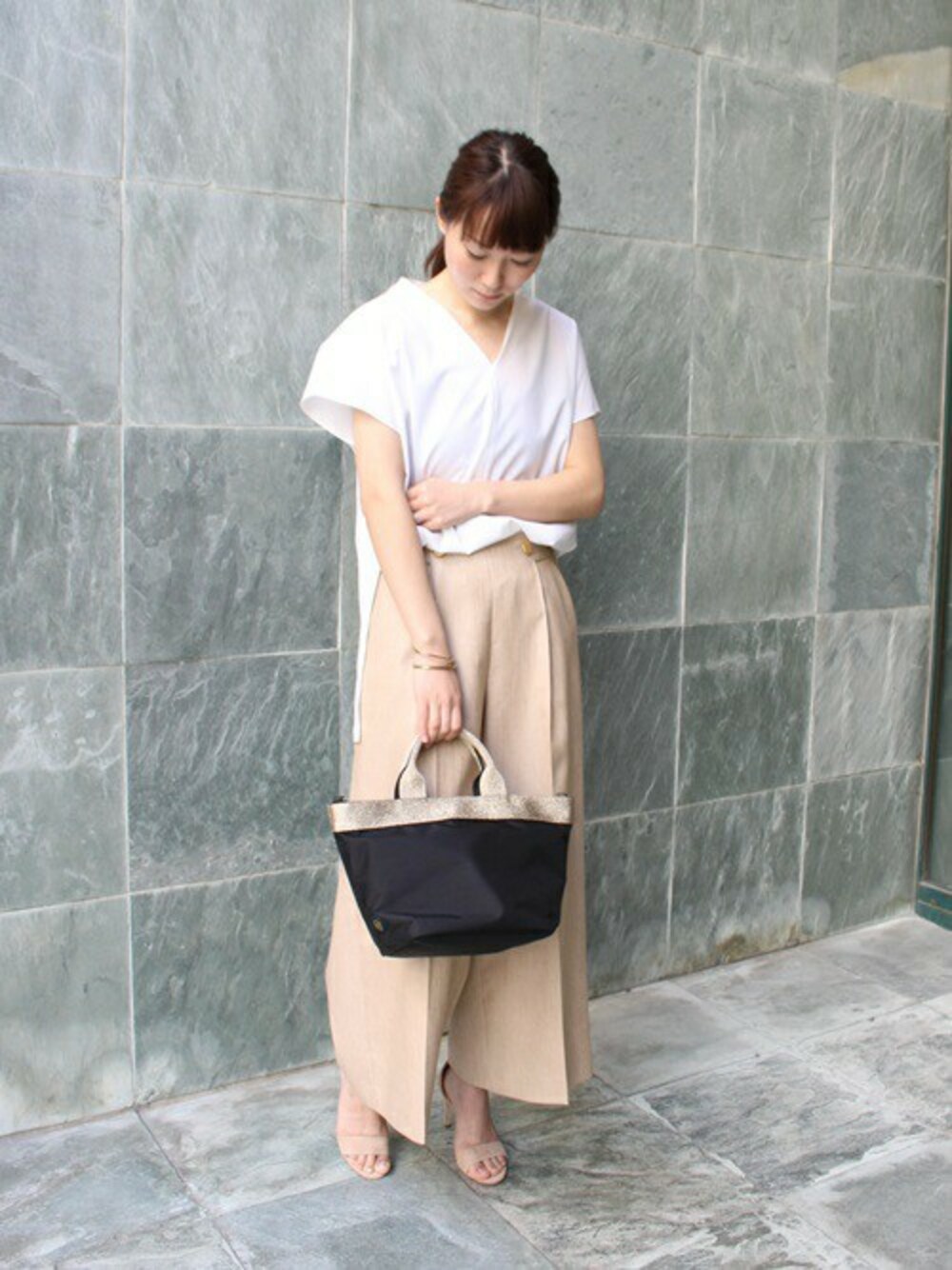 ナイロン素材のトートバッグは、大人レディをイメージしてコーディネート! ホワイト×ベージュの柔らかいトーンで全体をまとめつつも、濃色のバッグが主張しすぎずコーディネートのまとめ役に。 パンツとブラウスは。3月中に入荷いたします!