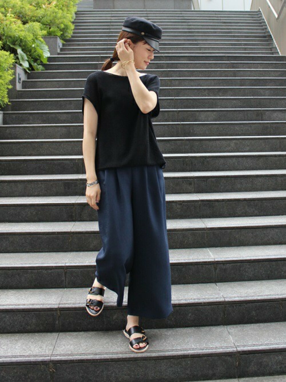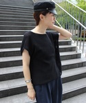 前後どちらでも着れる2wayプルオーバー。 サラッとした肌触りから、まさに夏のニット。 ブラック×ネイビーのカラーとワイドパンツのチョイスで、カジュアルモードな雰囲気に。