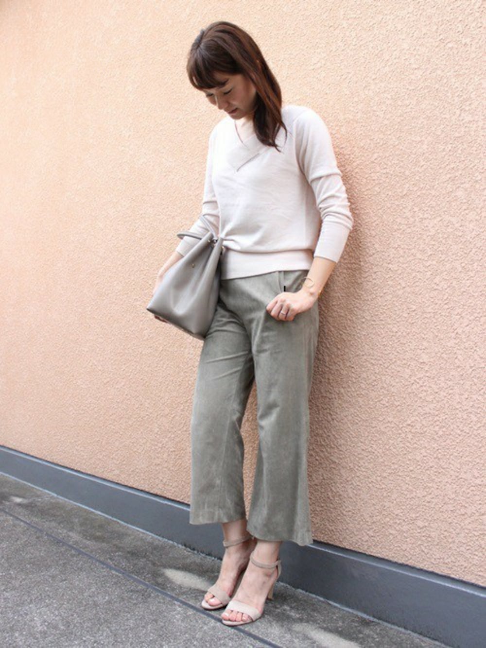 今シーズンの注目アイテム、ラッパデザインのパンツ。 想像以上の履き心地の良さにビックリします!ぜひお試しいただきたい、今秋のイチオシアイテムです。 好みの位置で衿ぐりの開き具合を変えられるニットは、ラフに着たかったので通常のVネックの位置で着てみました。 全体を柔らかいトーンで合わせたのも、お気に入りポイントです。