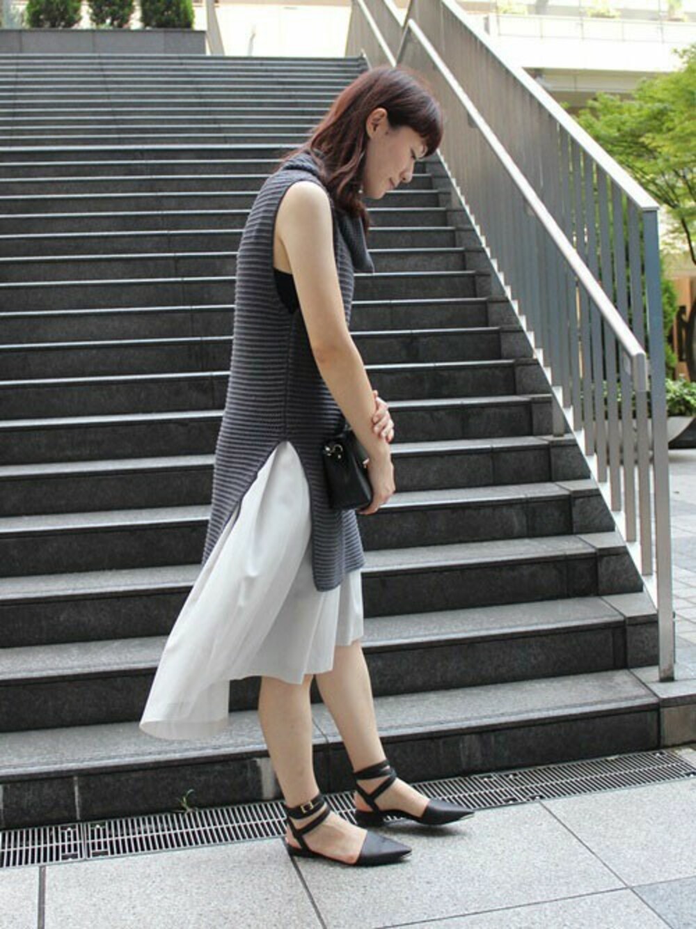 深めのサイドスリットが抜け感を作ってくれる縦長シルエットのニット。 イレギュラーヘムのスカートとあわせたバランス感が今年らしく、グレーのワントーンで秋を予感させて。