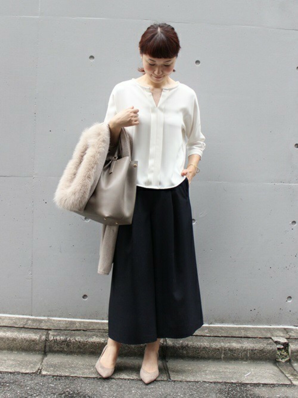 NOBLEのスタンダードアイテム“ドルマンスキッパーブラウス”。 どんなシーンにも対応できるデザインと着心地の良さが人気の理由! ワイドパンツとのシンプルなスタイリング。グッズは全てベージュで統一で、柔らかい女性らしさをプラスしてみました。