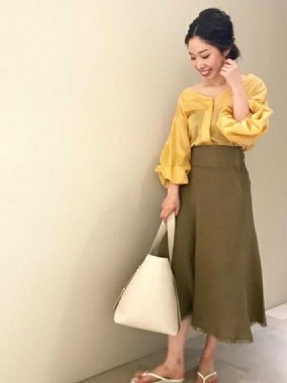 色はもちろん シルエットの美しさはお持ちのボトムを引きたたせてくれる 袖のボリュームから少し透けて見える腕周りも 清涼感があり真夏の日差しの中でも涼しげにあわせて