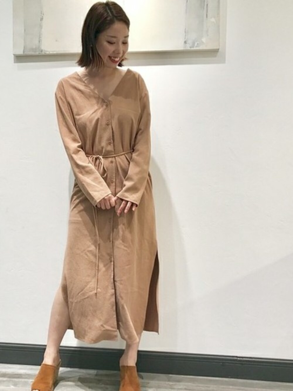OZMA シルク素材のワンピース フロントボタンが羽織りにもワンピースにもつかえる サイドのフリットからチラリと見える足も女らしさアップ