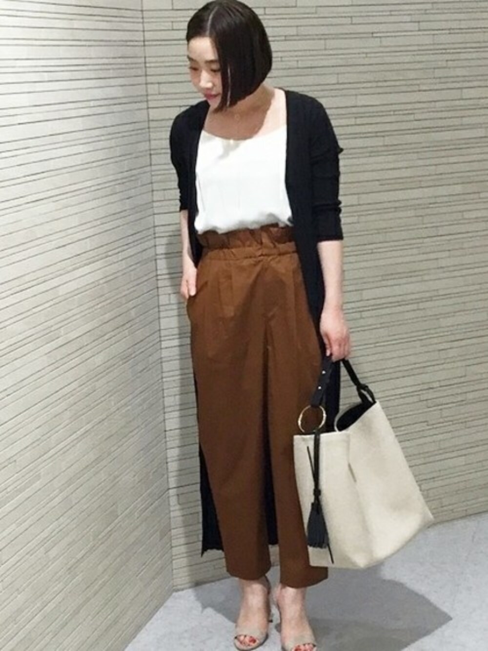 ウエストにボリュームのあるボトムスは、トップスをインして、ロングのリブカーディガンで縦のラインを作ってメリハリを
