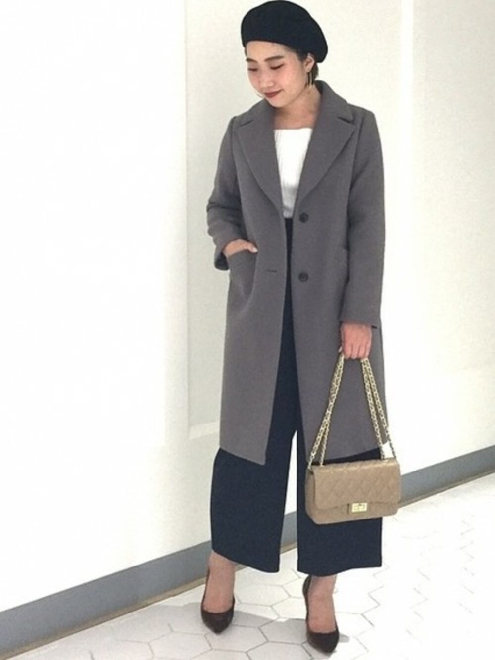 今年のトレンドをおさえたニュアンスカラーと、縦長ラインが美しいチェスターコート。