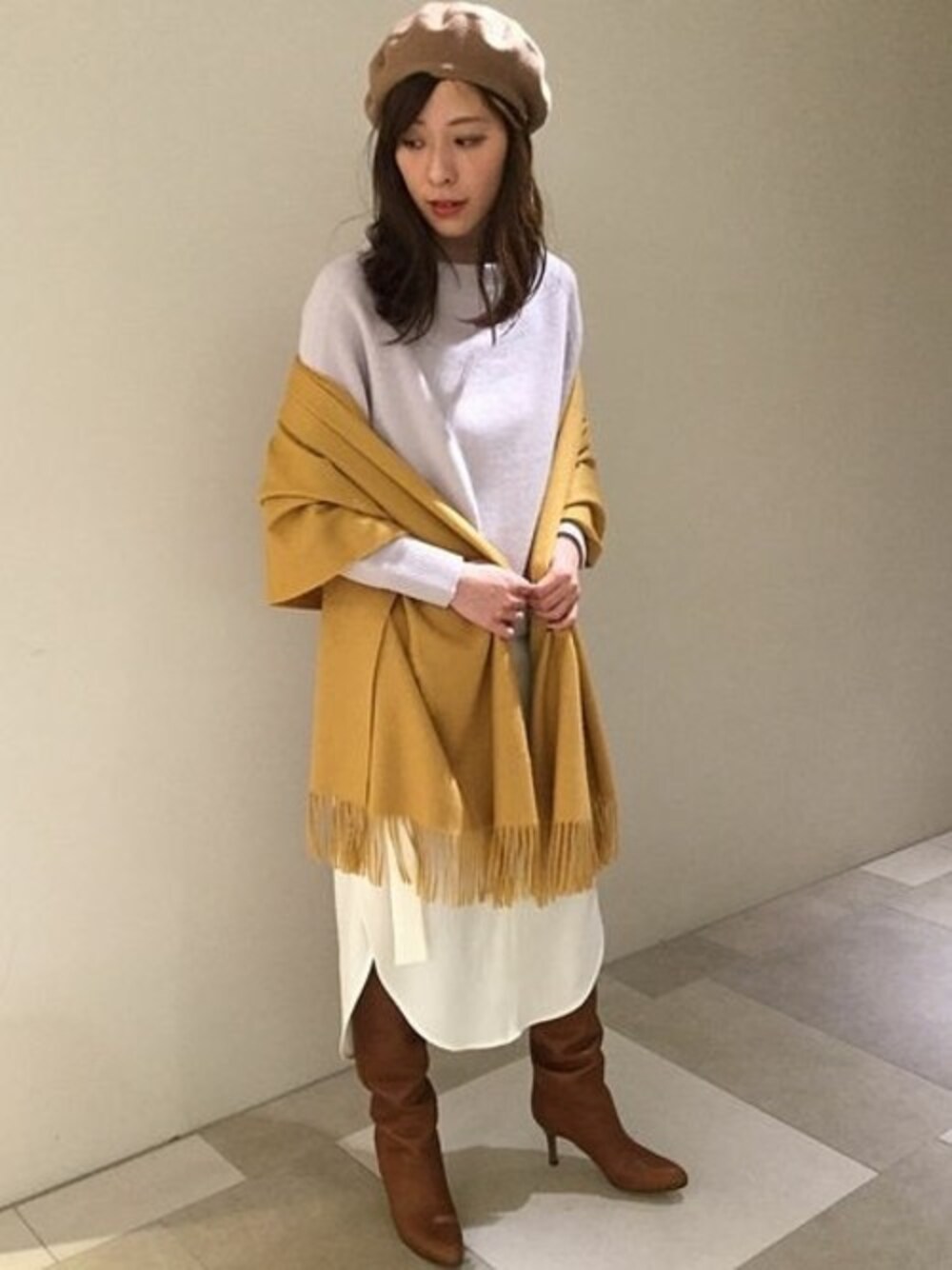 淡いカラーのスタイリングに マスタードイエローのストールでカラーを効かせて ベレー帽で遊びをさらにプラス