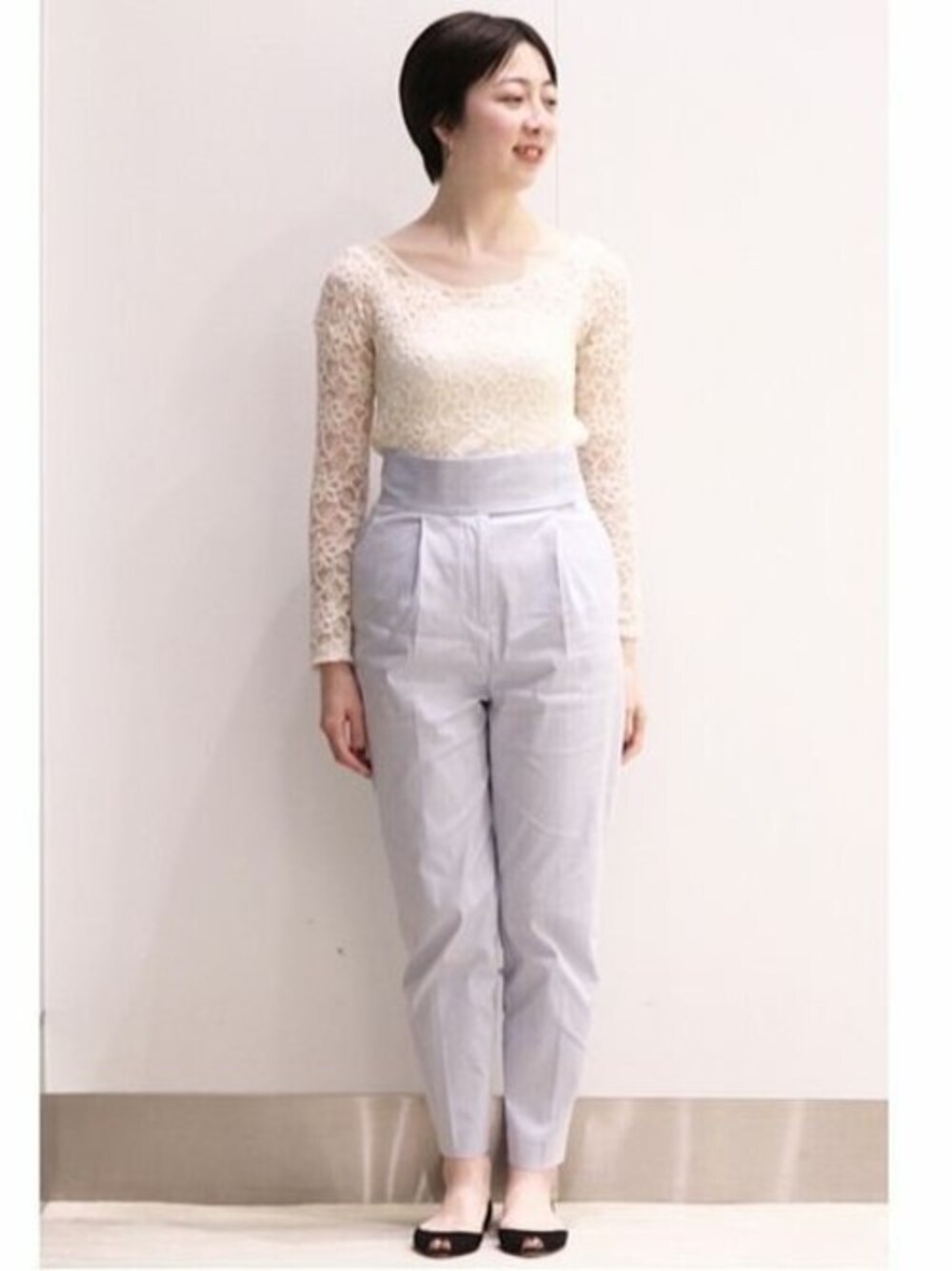 清涼感のある上品パンツスタイル 太めにデザインされたウエストベルトとハイウエストでスタイルアップを叶えてくれる美シルエットパンツ。 レーストップスをインして女性らしくクリーンなスタイリングに仕上げました。