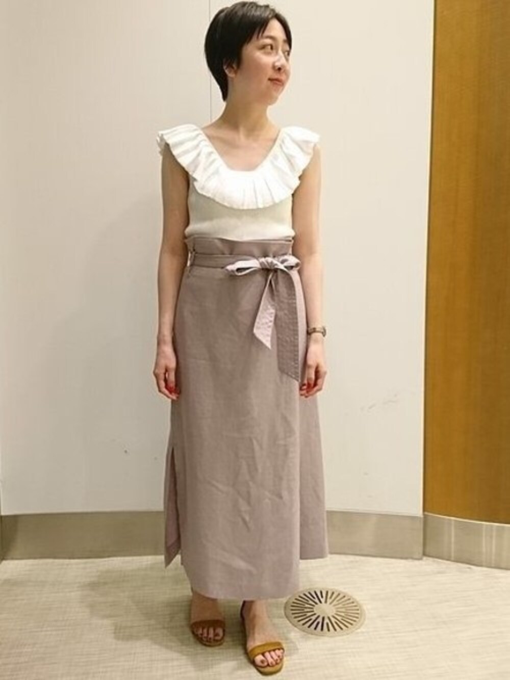 フェミニンなニットを主役に デコルテから肩までかかるフリルポイントがフェミニンな雰囲気のデザインニット。 深めに開いたUカーブの開き感が大人の色香を後押ししてくれます。 ラップスカートにインして品の良さをプラス◎
