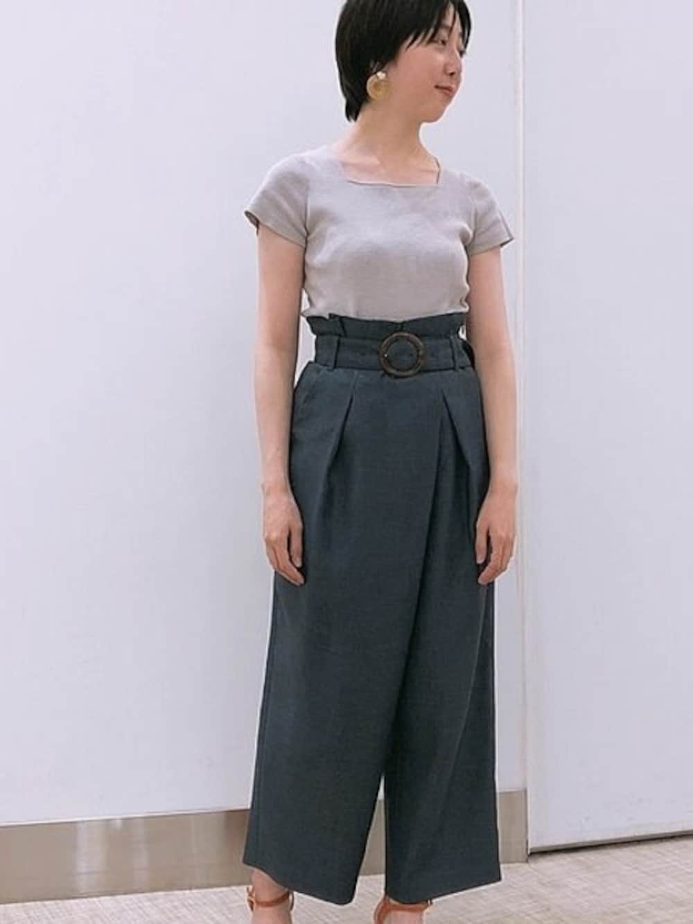 夏におすすめのカラーコーディネート 暑い季節におすすめのカラーコーディネート。グレーとくすんだブルーの色目が涼しげに見せてくれます。肌から離れたワイドパンツは素材感もハリがあり、おすすめのアイテムです。