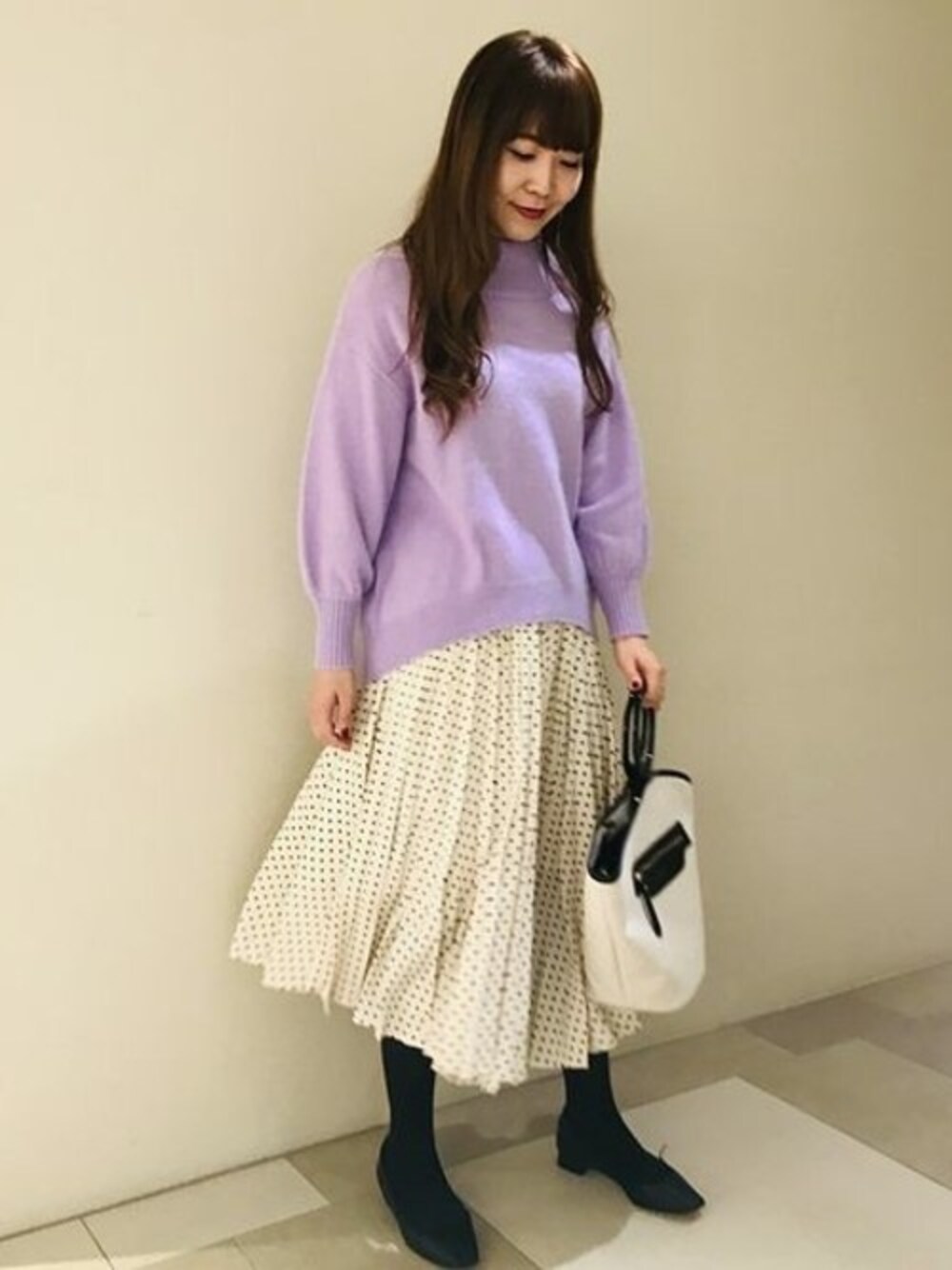 トレンドスタイル 柔らかな印象のパープルと、COELのドットフロントプリーツスカートを合わせたトレンドスタイル。