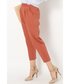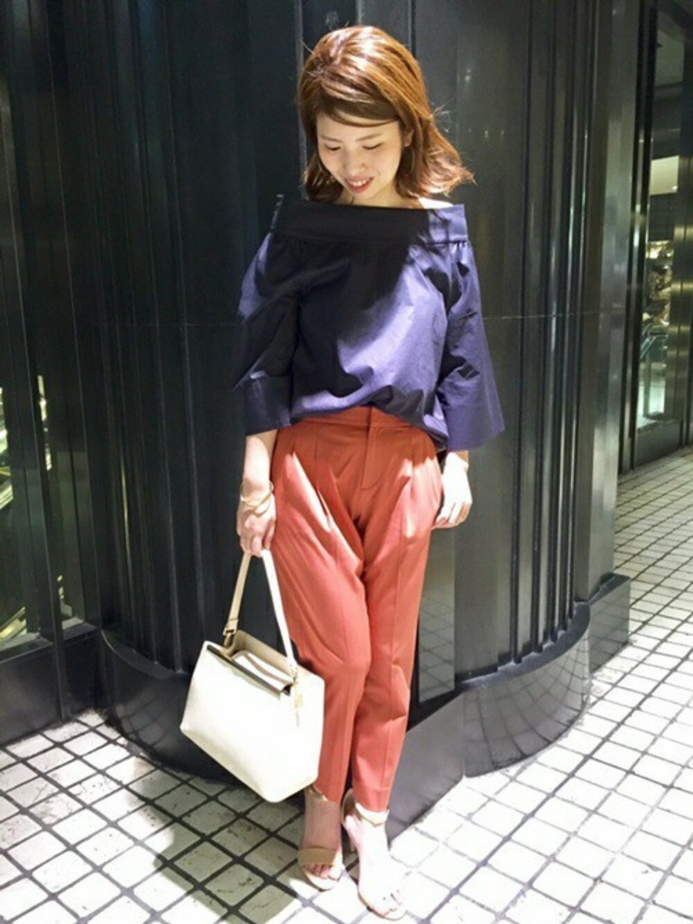 トレンドのテラコッタカラーのパンツは、ネイビーのブラウスと掛け合わせて新鮮に。 デコルテを綺麗に見せて女性らしい抜け感を。 グッズは、ベージュ×ゴールドまとめで上品さをプラス!