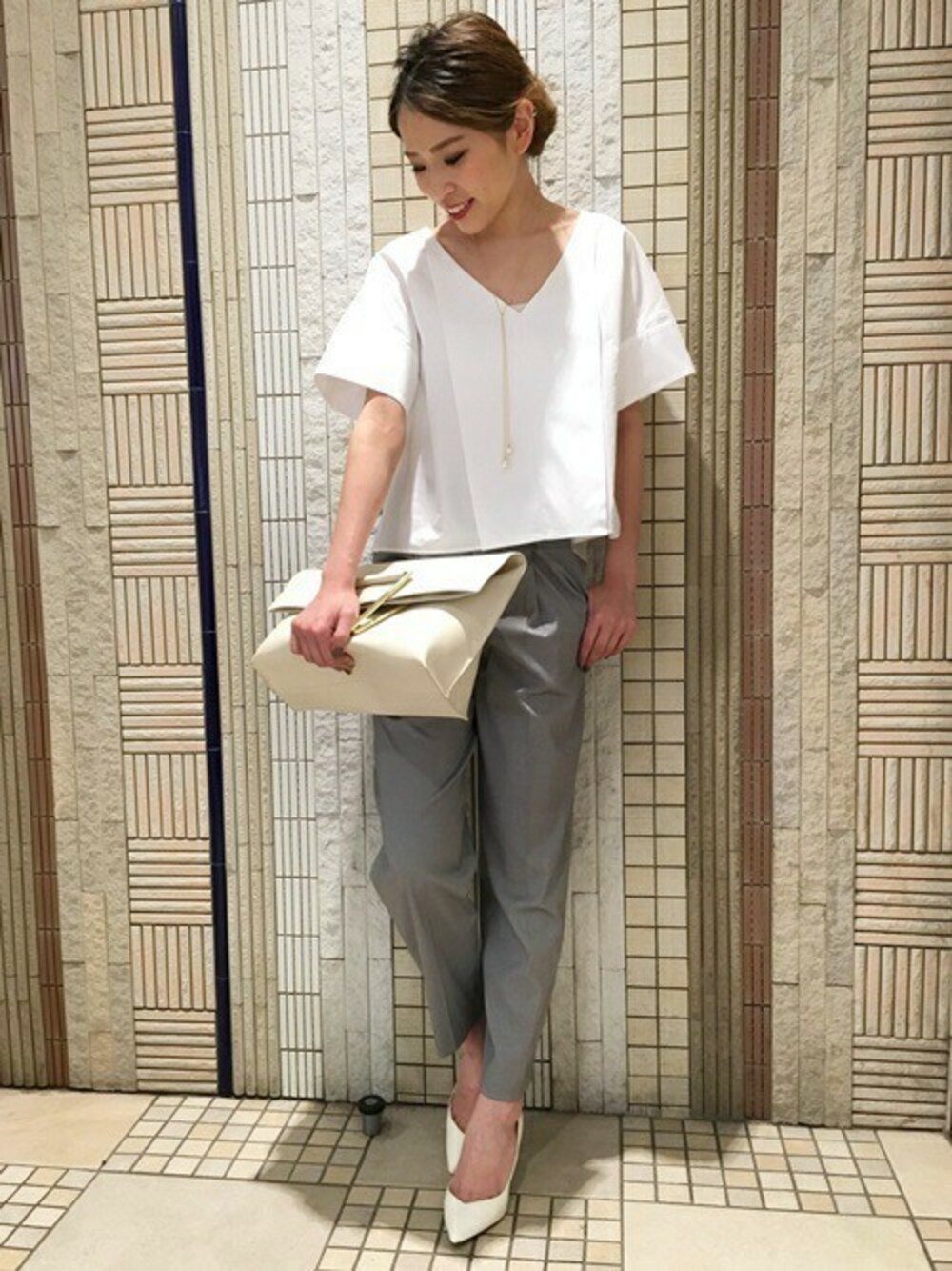 ハリ感が珍しいこちらのブラウス。 ベーシックなタックパンツとの合わせも 一枚で様になります。