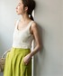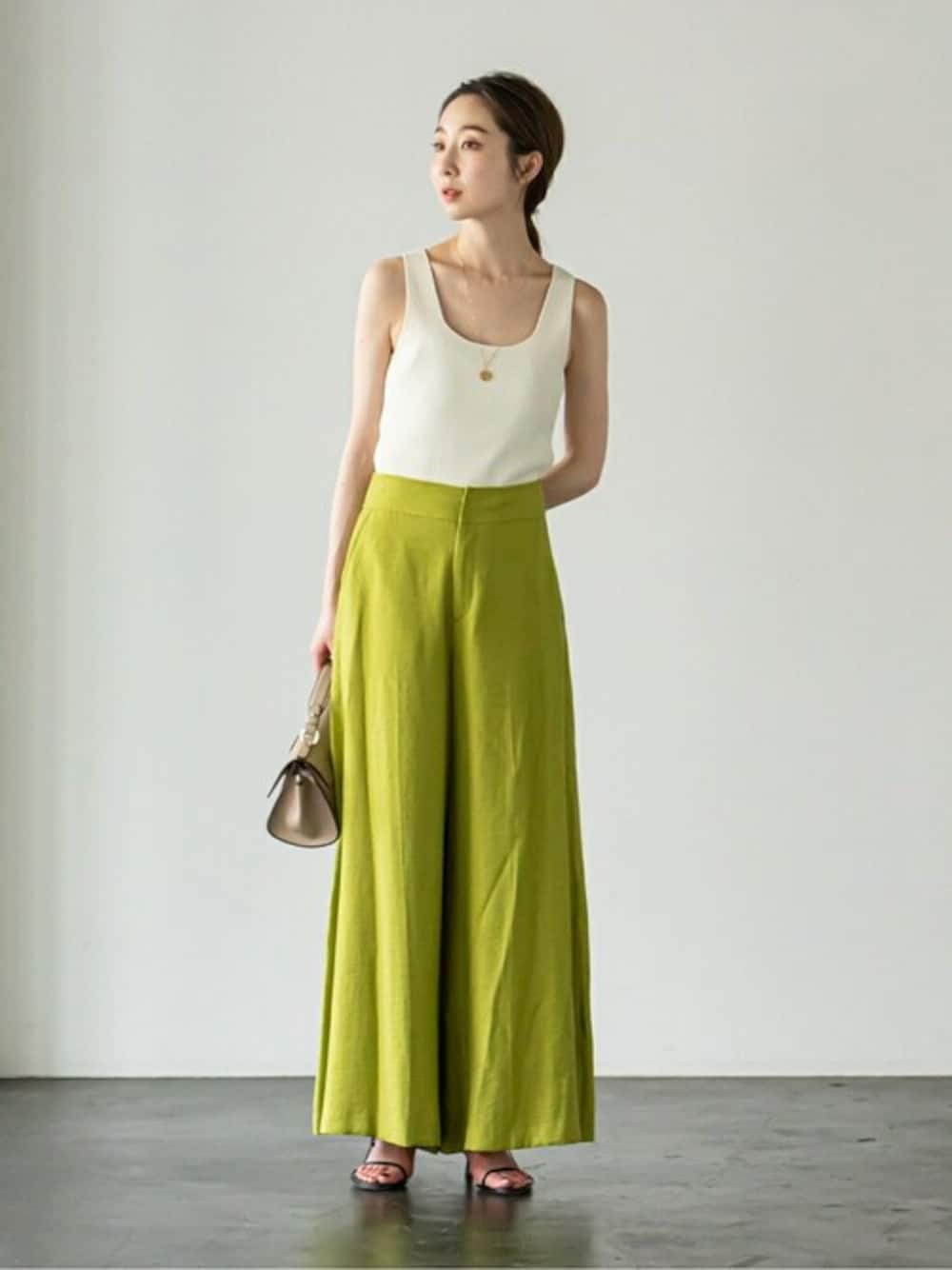 【ソフトスクエアーネックニットタンク】 程よいフィット感と肌見せデザインのニットタンクは、ワイドパンツとの相性◎ スッキリとした印象のコーディネートに。