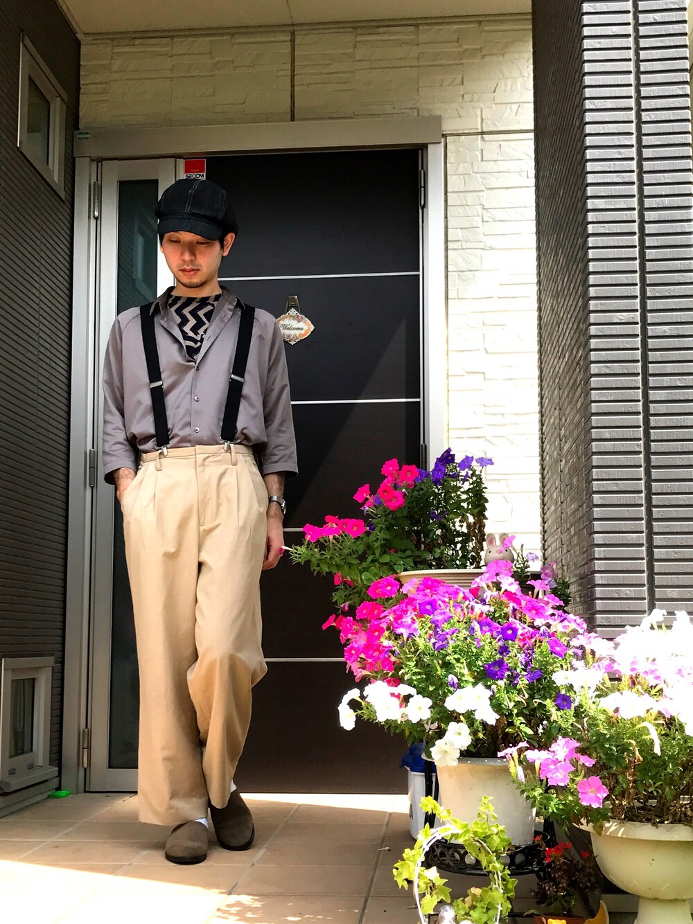 おはようございます☀ 今日はアースカラースタイル🏜 割と初めてのオールベージュ(ブラウン)❤️ 七分袖のサテンシャツをワイドパンツにインしました🌺 インナーに幾何学柄を入れて、それを見せるために、たまにモデルとかがやってる、インしてボタンたくさん開けるやつやってみました꒰✩⌯௰⌯꒱◞ 昨日のハーフタックインもそーですが、モデルみたいに上手くやるのは難しいですね😭😭 足元にもベージュのスリッパを入れてまとまりを与えましたー! コーディネートにメリハリをつけるために、黒サスペンダーをつけて、ピックアップタグでもある『キャスケット』をつけることで、古着屋店員みたいなイメージでまとめました(ˊ•̤ω•̤ˋ)💓 久しぶりにメガネとかグラサンかけなかったら、目瞑っちゃいました😂 こんなことならかけとけばよかった😂😂← それでは連勤最終日頑張ります!!✨