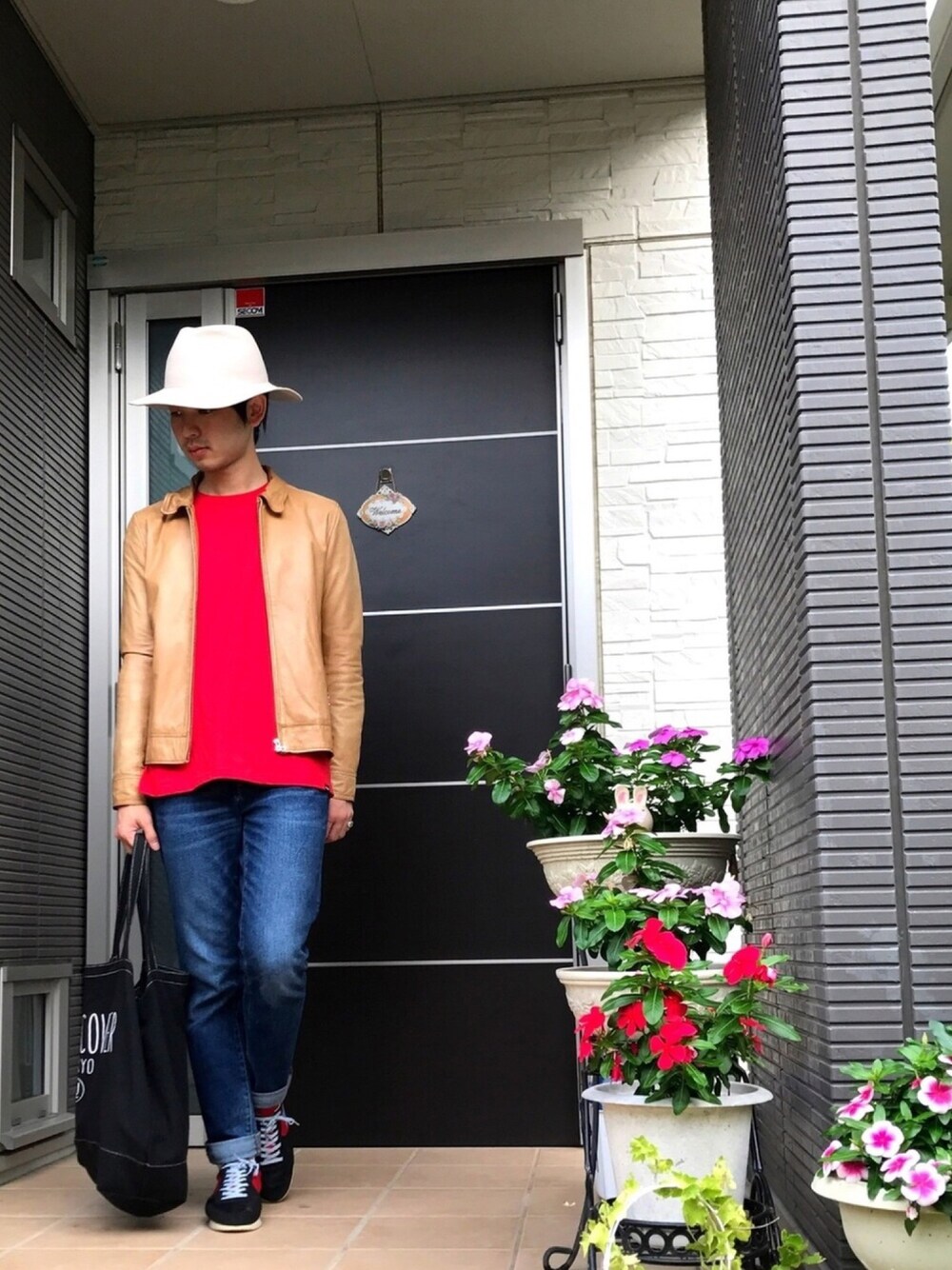 こんばんは〜🌟 お仕事休憩中です〜☕️ 今朝は、撮影する時間がなかったので、年に数回しかない撮り溜めコーデ更新✨꒰✩⌯௰⌯꒱◞ 毎日家出る時とかに撮ってるので基本撮り溜めがないんですが、これはディズニーで仮装した時に家から舞浜まで着てったコーデです😅 仮装あげたのであげるタイミングがなく溜まってました(笑) 撮り溜めは撮れない時に連続更新途絶えないようにするのに便利ですよね!← ということで9月末のコーデなので寒そうです! そして撮影の都合で髭がないです! スタイリングとしては、7年前から着てるHAREのラムレザーライダース!襟付きデザインでかつキャメルというかなり貴重なアイテムです❤️✨ インナーに大好きな赤、ボトムはウォッシュデニム、シューズはゴールデングースを合わせたカジュアルスタイルにまとまってます!! 白ハットで綺麗さを加えて完成です💡 たまには撮り溜めも良いですよね😅✌️ そんなとこです! 明日は母親の誕生日ということで、両親とディズニーシーに行ってきまーす!🌟😆 雨予報だけど、せめて曇ってくれることを願ってます😭😭😭 それでは〜! お仕事戻りまーす!