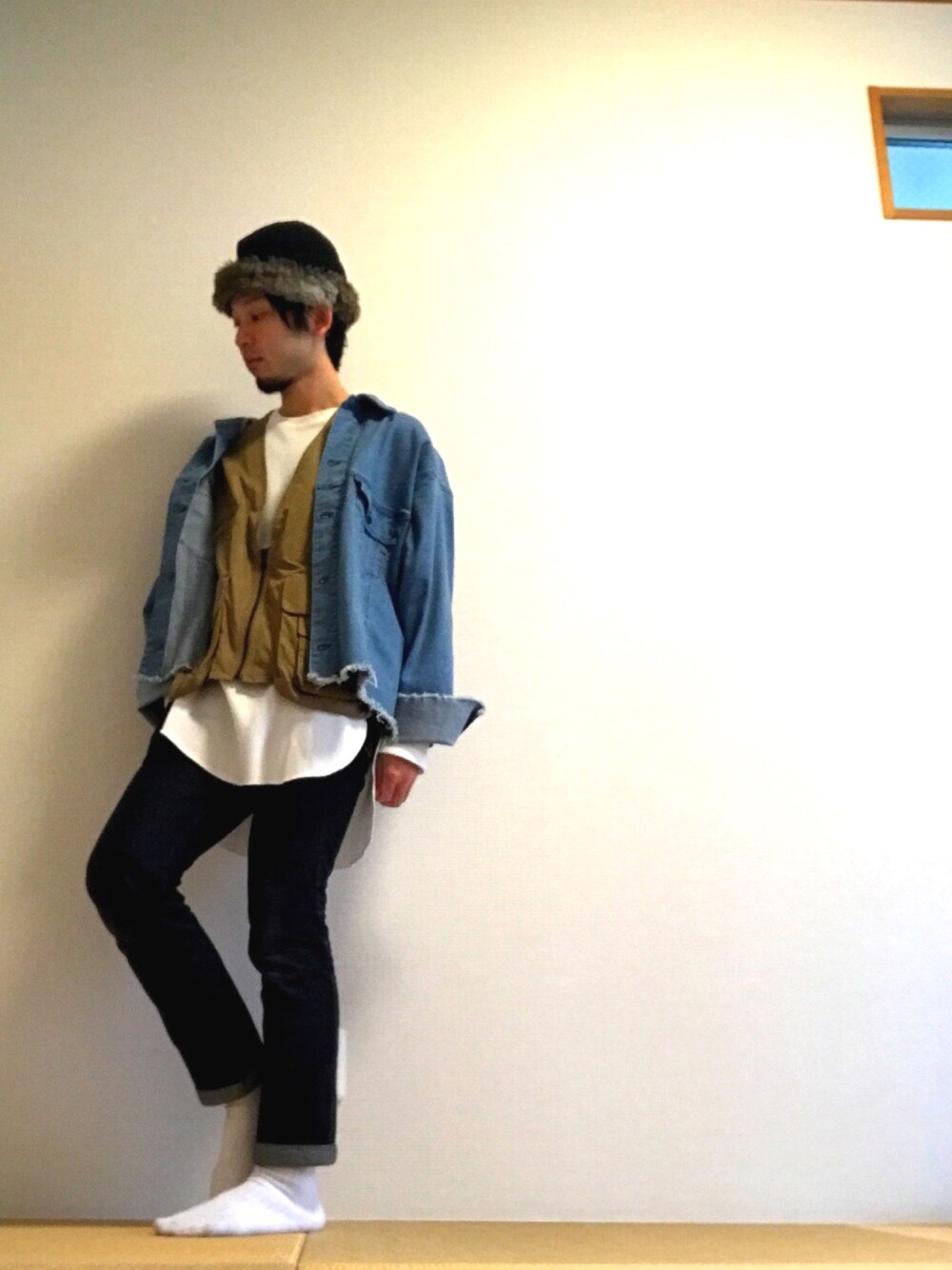 おはようございます☀ 今日は久しぶりの部屋撮りです!📷 屋内の時は普段は玄関で撮りますが、デニムとかベージュとか色味的にわかりづらそうな服を着てたので、白壁のある和室で🇯🇵 ピックアップタグの『デニムスキニー』に乗っかって、久しぶりにファクトタムのデニムを履きました❤️ 最近ワイドばっかだったのでなんか新鮮でした〜🌟 スーパーロングカットソーにベージュのハンティングベストを当てて、ビッグGジャンを羽織った大人カジュアルなデニムオンデニムです😎❤️ 普通かなーと思ったのでファーキャップで遊びを加えました!꒰✩⌯௰⌯꒱◞ そんなとことです! それでは〜