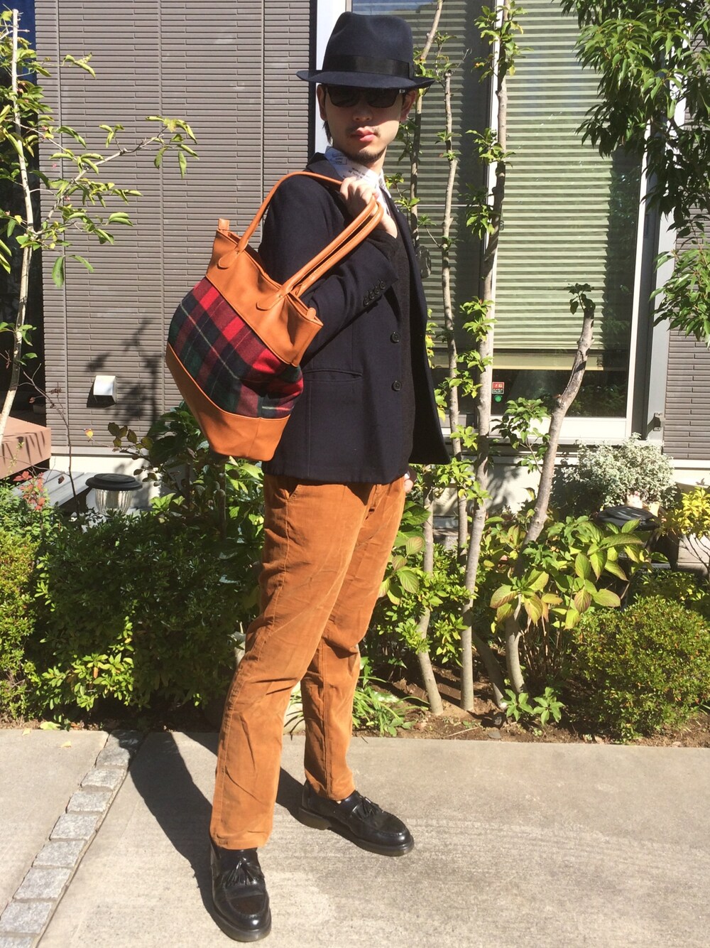 連続ジャケットコーデです! ちなみに本日外泊なので明日もジャケットの予定です(笑) やっぱ秋はジャケットですよね! 角度的に見えづらかったですが、インナーにはフランス語が敷き詰められてるHAREのシャツに毎年出ている定番のRAGEBLUEのニットソーを合わせました! バッグをチェック、ボトムをマスタードカラーのコーデュロイパンツにして、秋らしさを演出してみました! 定番シンプルコーデです! PS.眩しかったのでサングラスかけたら顔が消えちゃいました(;´・ω・)