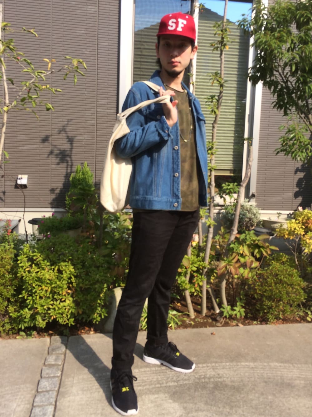 今日はらしくないスクールコーデ! 仕事が作業が多い日なのと、おニューの赤キャップをかぶってみたかったので動きやすくカジュアルめに! シンプルながらもインナーとソックスにカモフラ柄など遊びはいれてます! 今日も仕事がんばるぞー