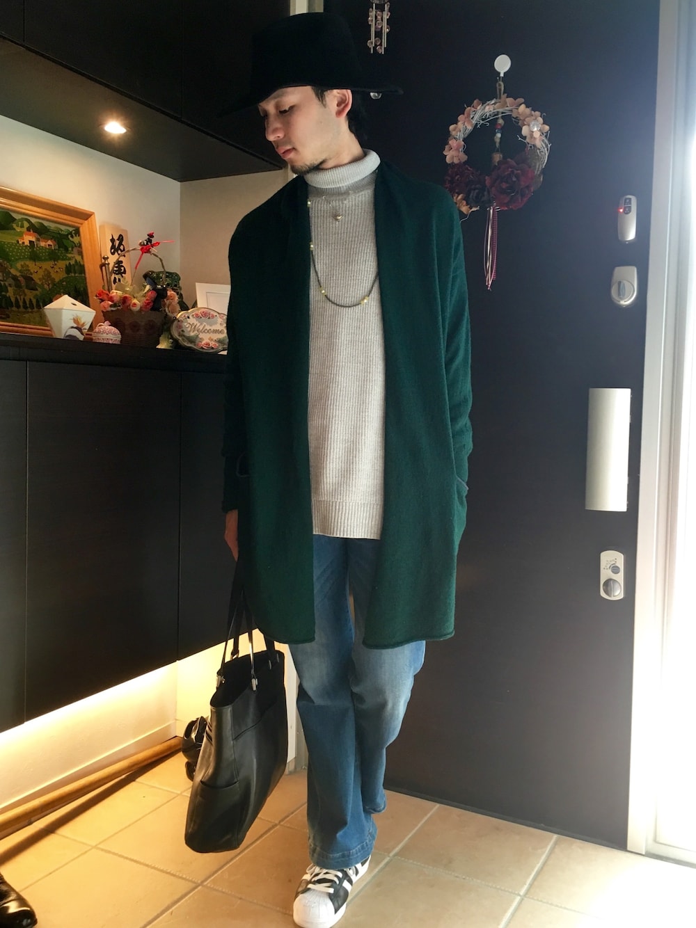今日は家の玄関で撮影! グレーのタートルニットにモスグリーンのロングカーディガンを合わせたニットオンニットなコーディネート! ボトムにフレアデニムを持ってきてロング丈とのコンビでAラインを綺麗に出しました! カーディガンとボトムがレディースなこともあり、フェミニンなコーデになりました。 小窓には一昨日乗ったダッフィーライナーの写真を♪ 車内のソファも、つり皮もダッフィー素材でもふもふしててめっちゃ可愛かったです(*´꒳`*) それではお仕事行ってきます!