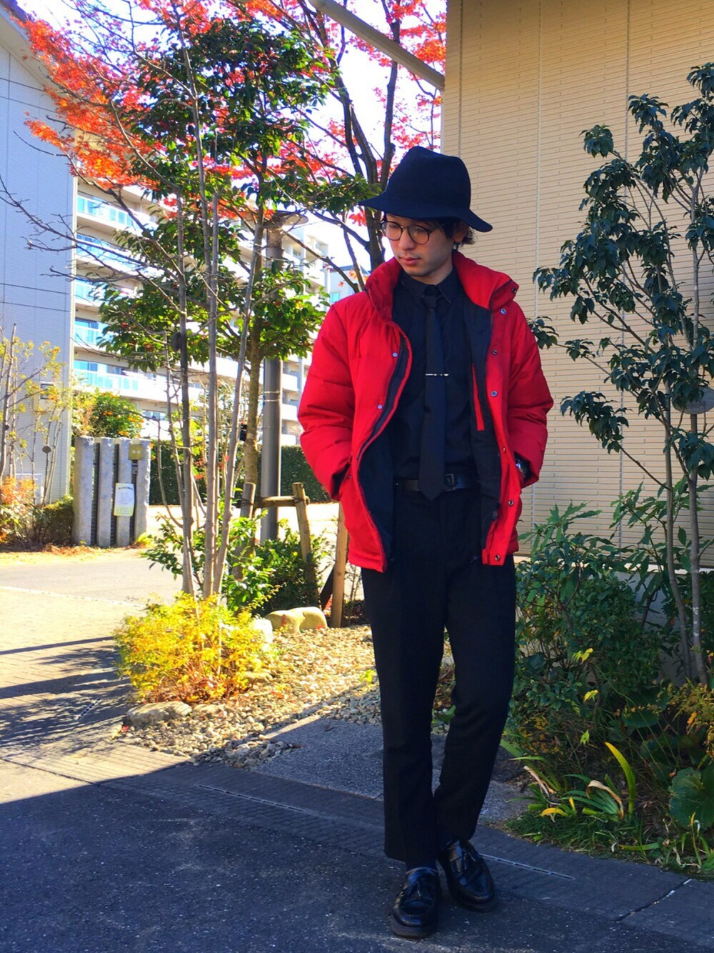 おはようございますー☀️ 私事ながら今日で25歳になりましたー!🎂 こないだの笑顔写真の日に誕生日の気分でしたが、実際は今日でした(笑) さてコーディネートですが、先日も着た、野暮ったくなりがちなダウンジャケットを使ったスタイリング😁🎀 ダウンが赤で色の主張が強いので、他はオールブラックで締めました!🍷 黒シャツを黒タイでタイドアップし、スラックスにタックインして、ローファー、ハットという一件マフィ○みたいな組み合わせでも、赤ダウンでカジュアルさを加え、メガネでインテリ感を出すことで、俗にいう『きれいめカジュアル』なスタイリングにしました꒰✩⌯௰⌯꒱◞ フードを外したのもきれいさを出すのに一役買ってます!(笑) タイピンはボールペン型だったり、ソックスはいちごだったりと細部にこだわって見ました🌟♥️ そんな感じです! それではお稽古行ってきまーす🎵🎵