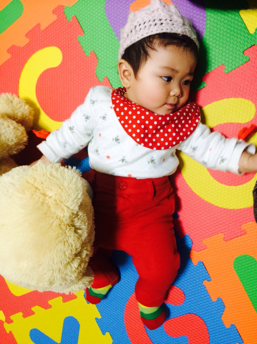 もうすぐお気に入りのハチさんロンパースがピチピチで着れなくなってしまうので、それに合わせて赤でコーディネートしてみました(´・Д・)」♡