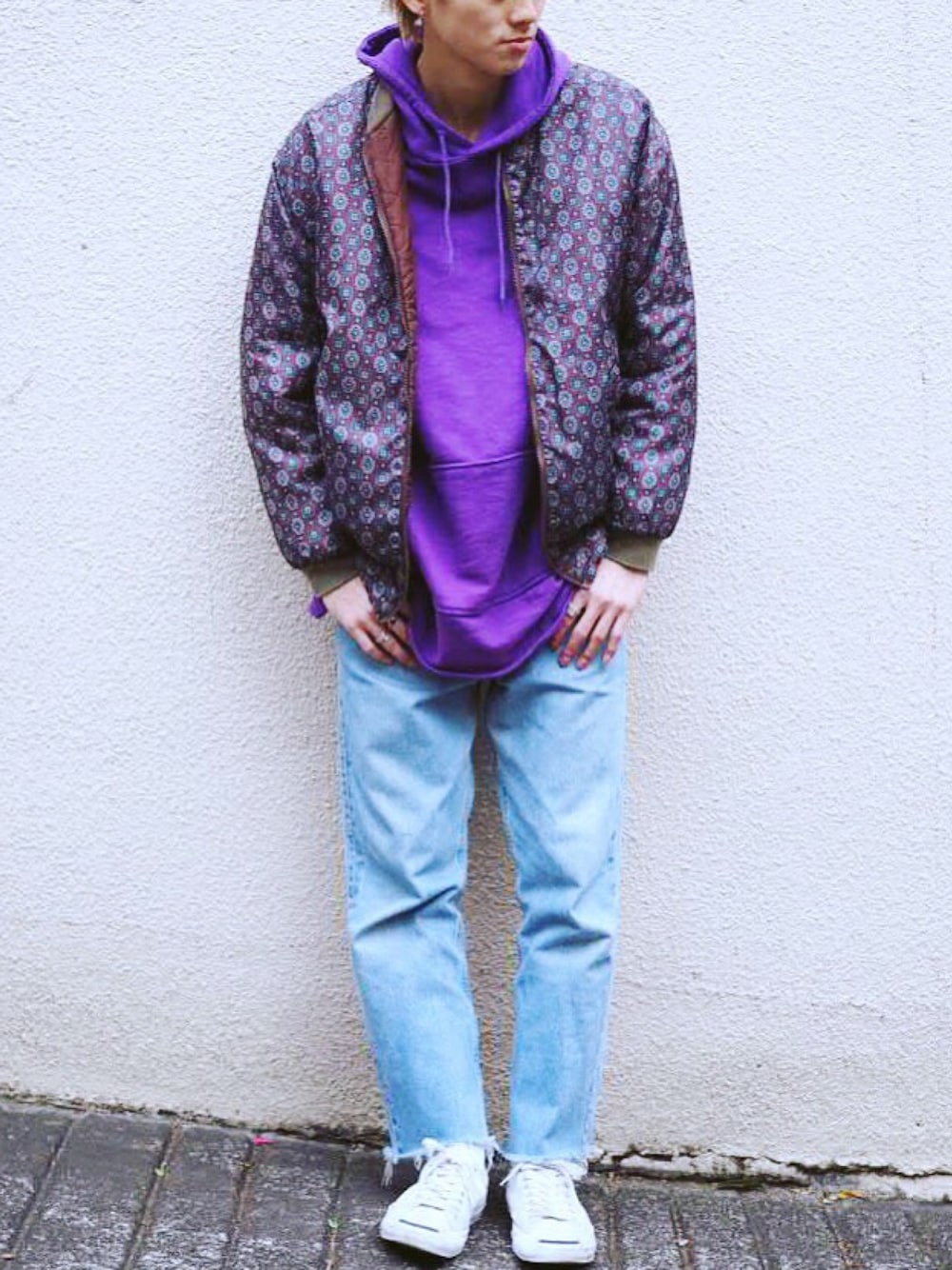 紫パーカーon柄でインパクト! 派手好きです🔥