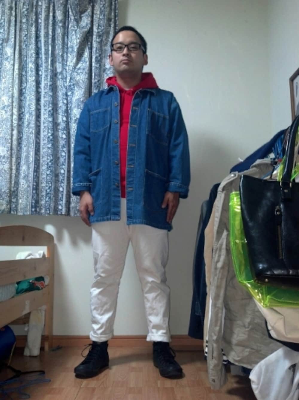 古着のカバーオールに、差し色で真っ赤なパーカーを合わせました。