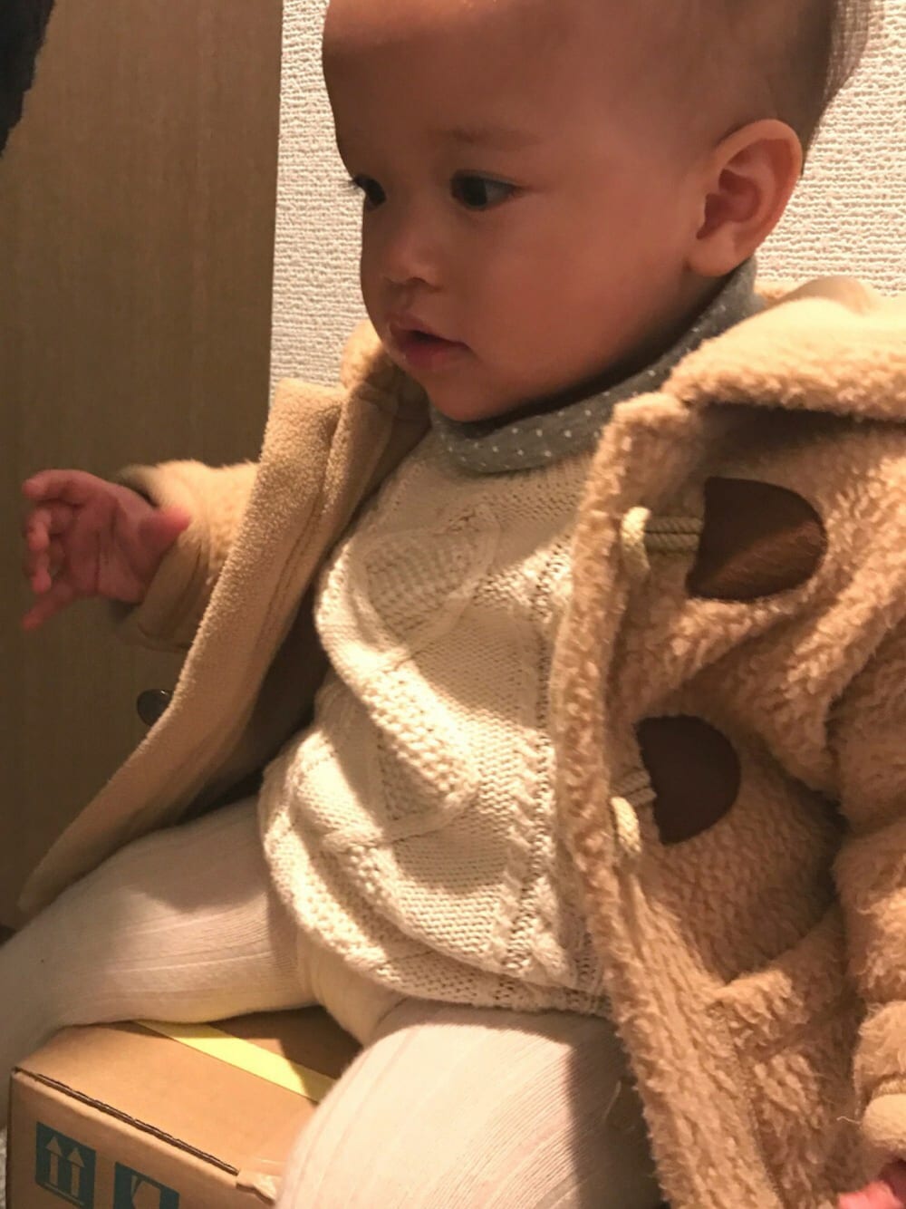 最近購入したUNIQLOのフリース素材のダッフルコートを着てお出かけ♡パパにクックを履かせてもらっているところ。早く歩きたくて仕方ない‼︎