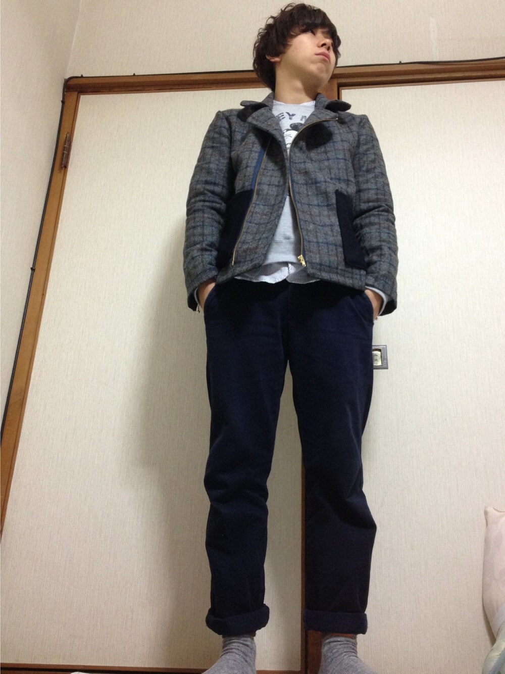グレーとネイビーの二色であわせました。 ライダースジャケットは、手作りで番組で嵐の 相葉くんがきていたものを参考につくりました! お気に入りです!!