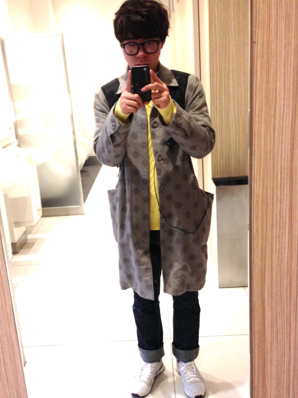 白のスニーカーと黄色のニットで春らしく、まださむいので、ニットの色がはえる、グレーのコートをあわせました!!水玉柄なのでインパクトだいですwと思ったのですが、今日わ思いのほか暖かく💦 ちとあついです(°_°)