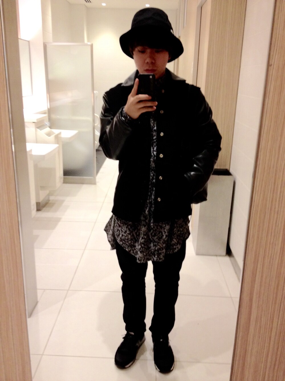 今日わ手作り三弾目のスタジャンを着てコーディネートしました!モノトーンコーデです!インナーわペイズリー柄のロングシャツになっています 雨だったので夜わ寒いかなと思ったのですが、もう四月ですからあついですねw